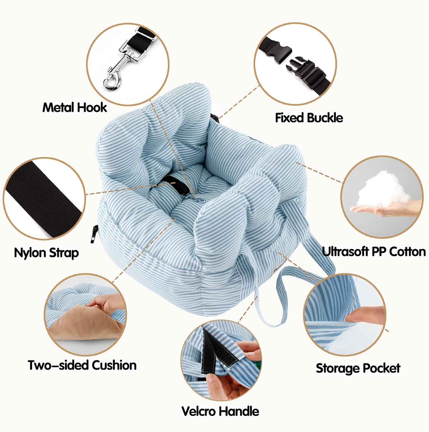 Dog Car Seat for Small Dogs, Portable Puppy Car Seat of Easy Installation, Fashionable Pet Carrier Bag with Large Pockets, Machine Washable Dog Booster Seat (Striped Blue)