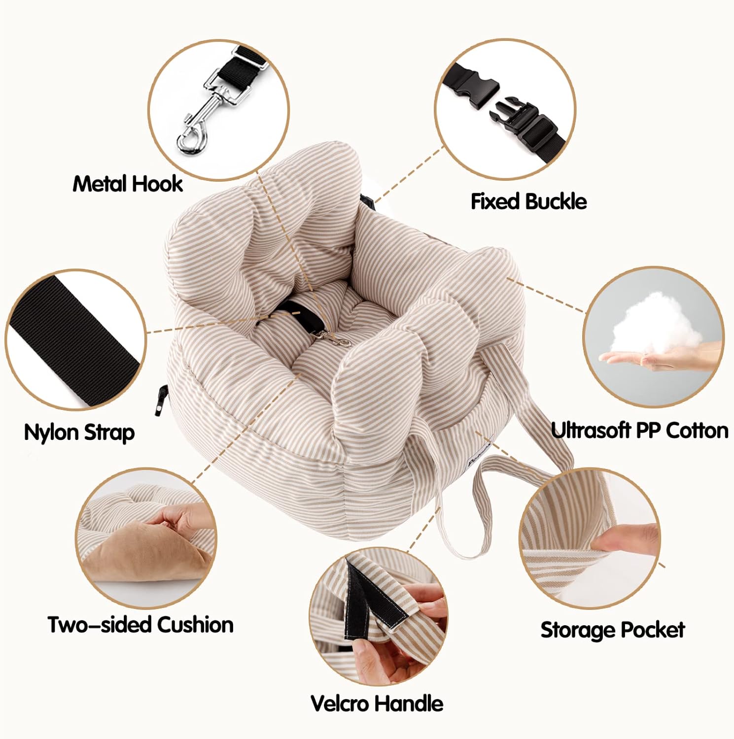 Dog Car Seat for Small Dogs, Portable Puppy Car Seat of Easy Installation, Fashionable Pet Carrier Bag with Large Pockets, Machine Washable Dog Booster Seat (Striped Khaki)