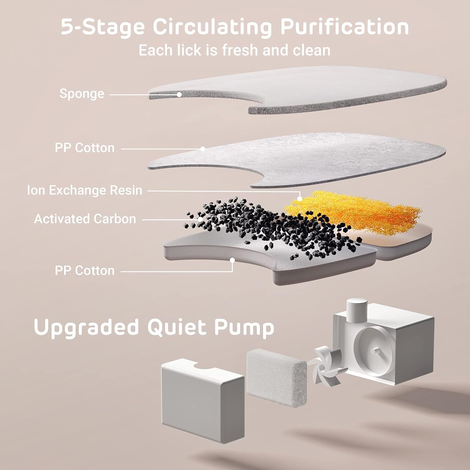 - Hygienic 5-Stage Circulating Filtration System - Consists of two filters, the cat fountain stainless steel provides a healthy and oxygen-enriched waterfall for pets