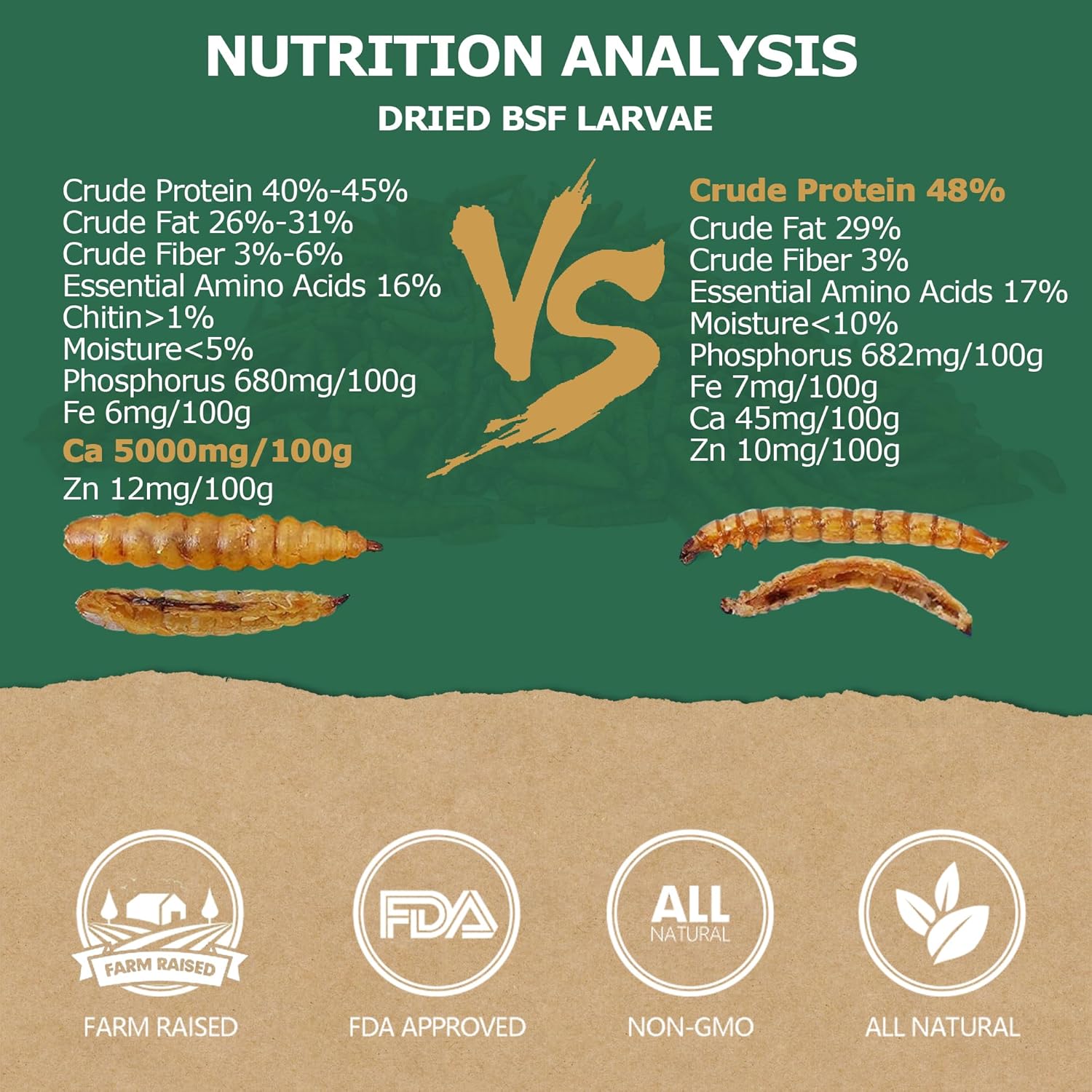 - Empowering Poultry Health: Revel in extraordinary health benefits that invigorate your poultry's well-being - fortified eggshells, amplified energy, and egg production. With calcium levels 85 times that of conventional mealworms, itβs perfect for molting, supplying vital protein and calcium sans extra supplementation.