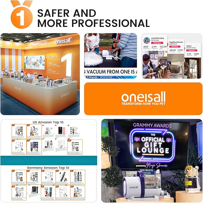 - 【7 in 1 Pro Pet Grooming Kit,Keep the House Tidy】oneisall pet grooming kit with vacuum make home grooming easy.The grooming brush and the deshedding tool gently remove loose hair and making pet hair shiny and smooth while eliminating tangles. Electric clipper, dog paw trimmer and dog nail grinder provides excellent cutting. Give your pet a best grooming experience. Nozzle head and Cleaning brush can be used for collecting pet hair falling on the carpet, sofa and floor