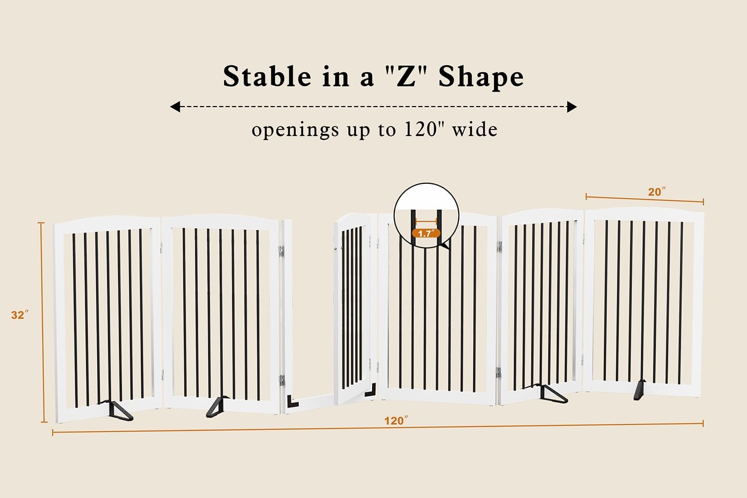 Freestanding Pet Gate with Door, Tall Dog Gate for House, Extra Wide, Pet Puppy Safety Fence, Support Feet Included, 120 Inch Wide, 6 Panels 32" Tall, White & Black