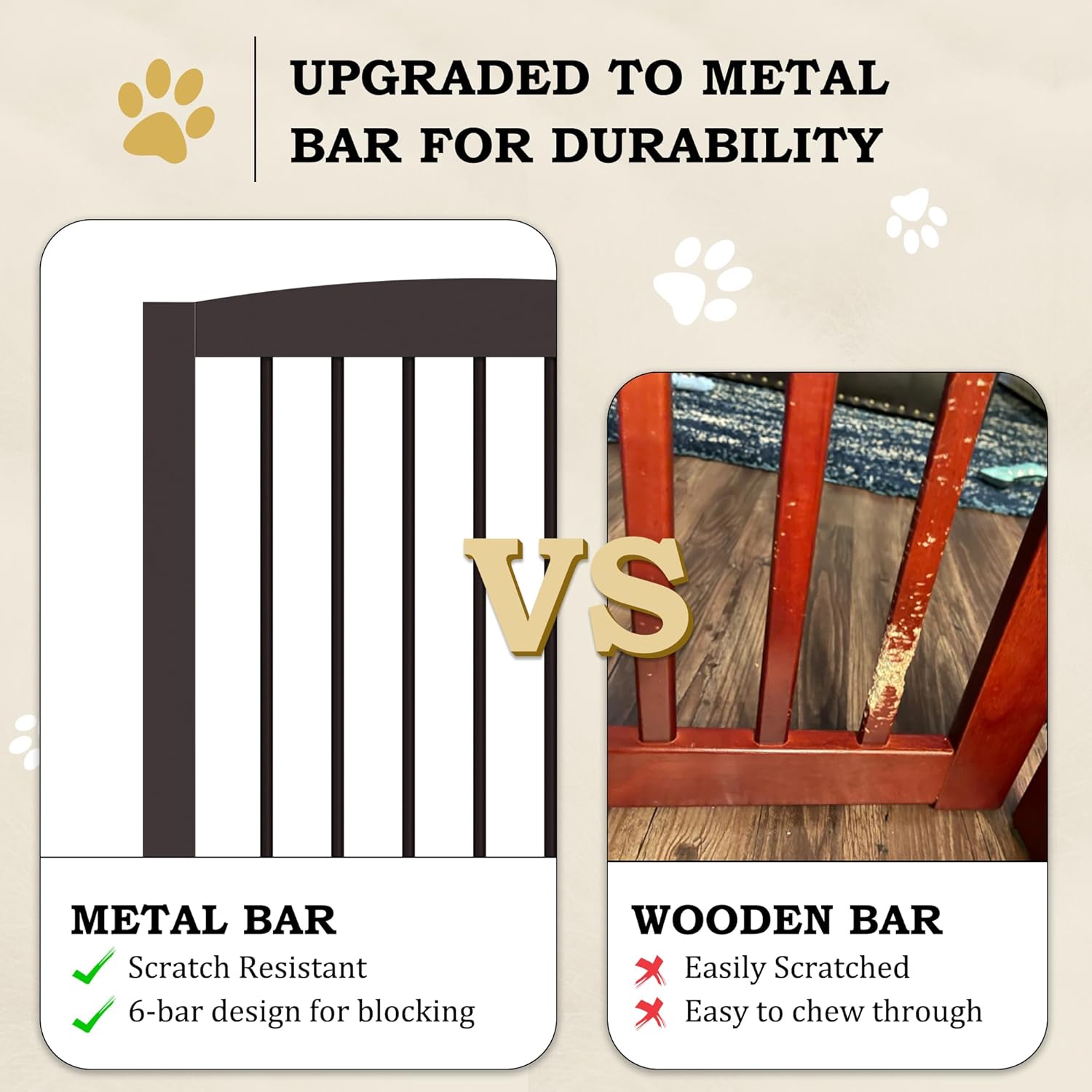 - 【Sturdy and Durable Construction】: Made with high-quality MDF materials, this pet gates for dogs are sturdy and durable. The exclusive metal support feet included with the walk through pet gate provide added stability and security, ensuring that the freestanding dog gates remains in place and does not wobble or tip over. Sturdy hinges that can rotate 360° to accommodate different shapes.