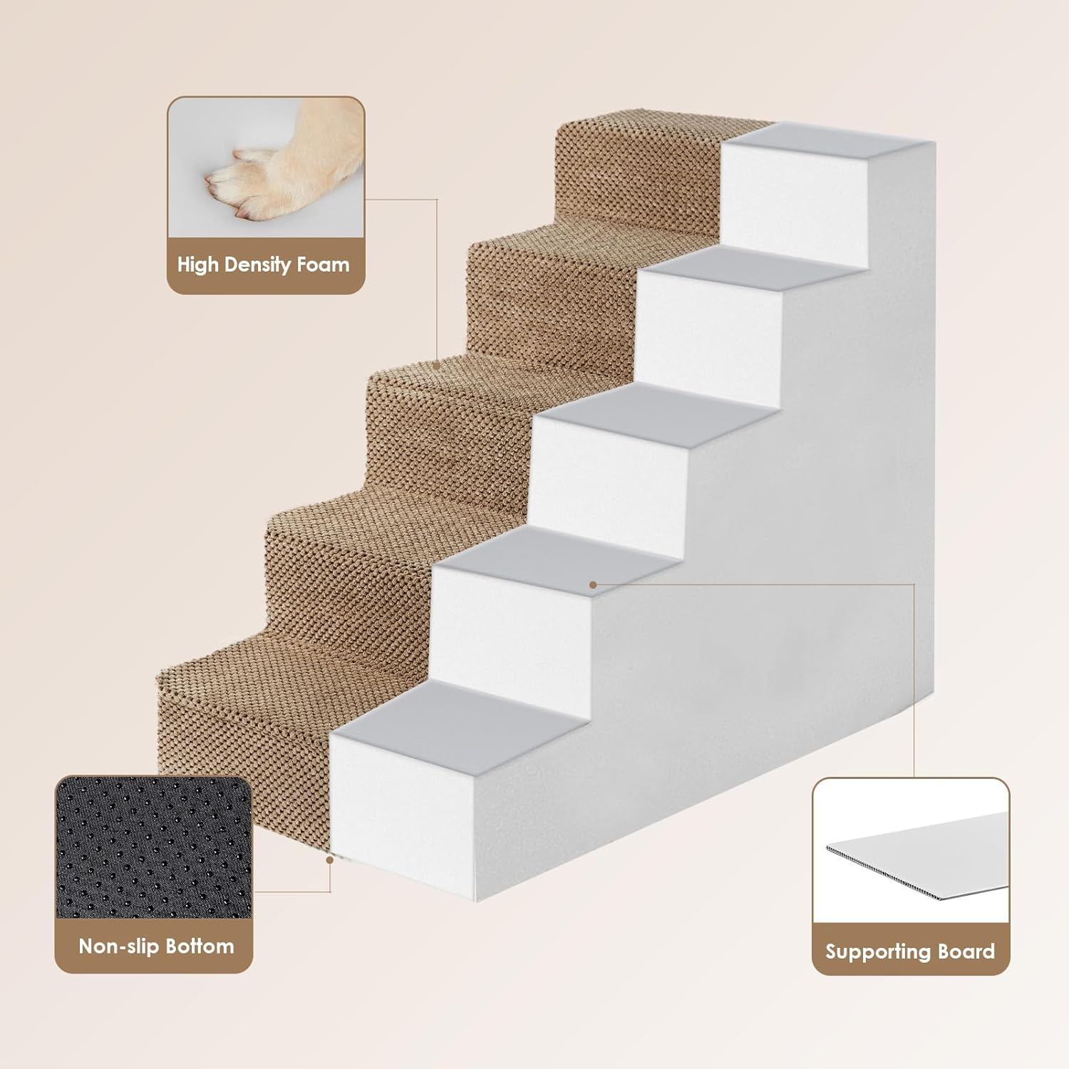 EHEYCIGA Dog Stairs for High Bed 22.5" H, 5-Step Dog Steps for Bed, Pet Steps for Small Dogs and Cats, Non-Slip Balanced Pet Ramp Indoor, Camel