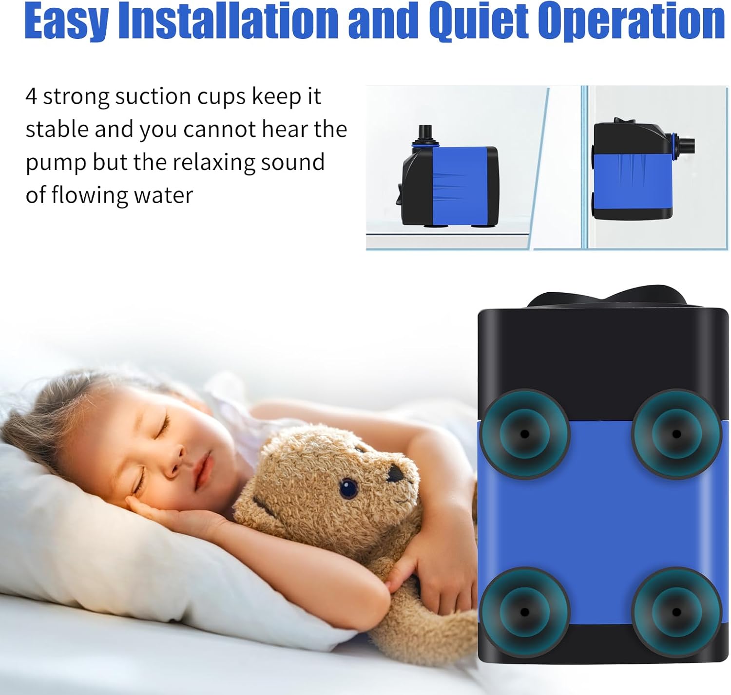 - Wide Application: This submersible water pump is designed for indoor and outdoor fountains, aquarium fish tank, water table, small pond waterfall, bird bath, and hydroponic systems