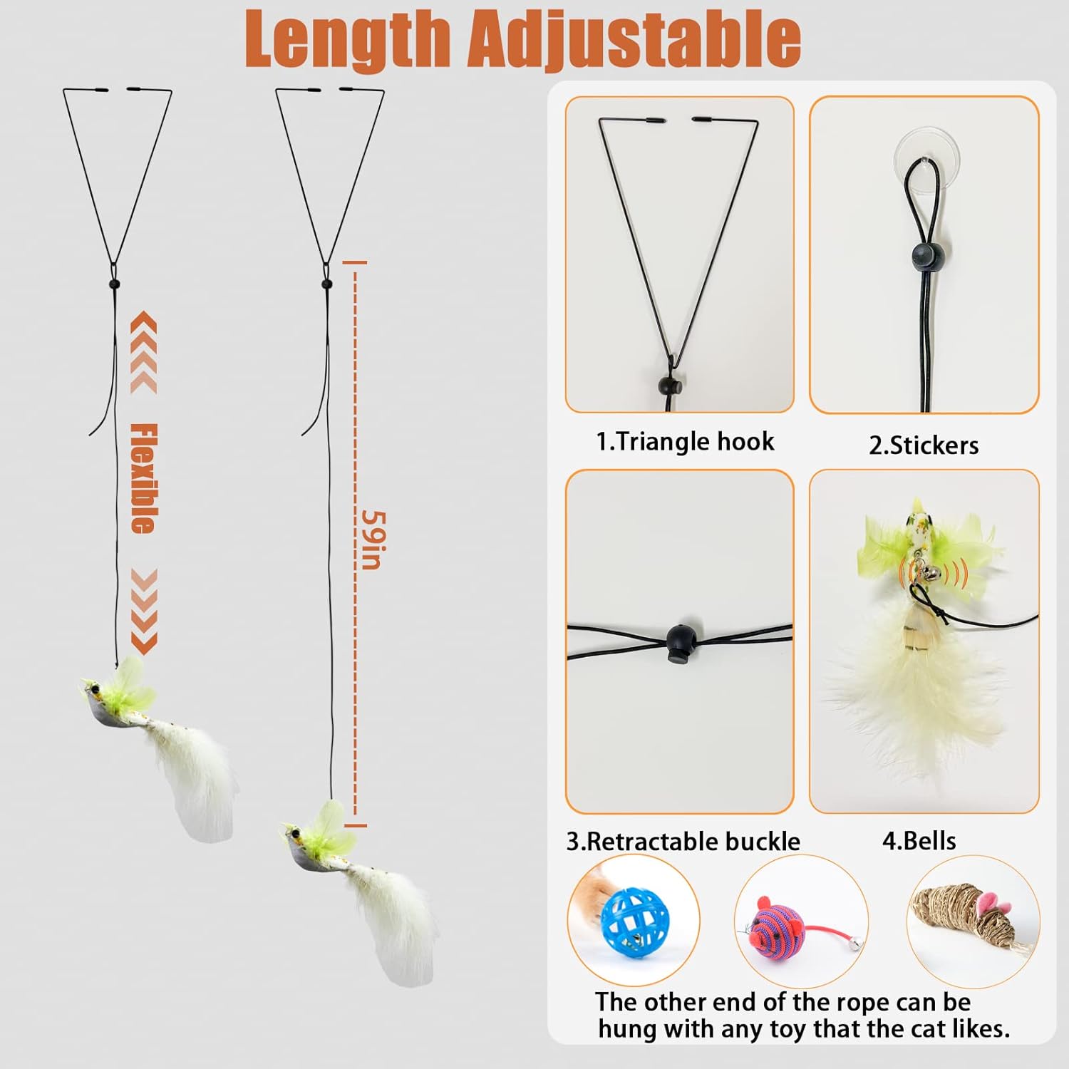 - 【Hanging door cat toy】 2023New indoor cat toys can be hung on door frames, doors, can be hung anywhere using stickers, whenever your cat touches the hanging kitty toys, the fluffy bird cat toys will move in a shaking way, the bells on the string will make a clanging sound to attract the cat's attention more, it allows the cat to get exercise and prevent obesity and boredom.
