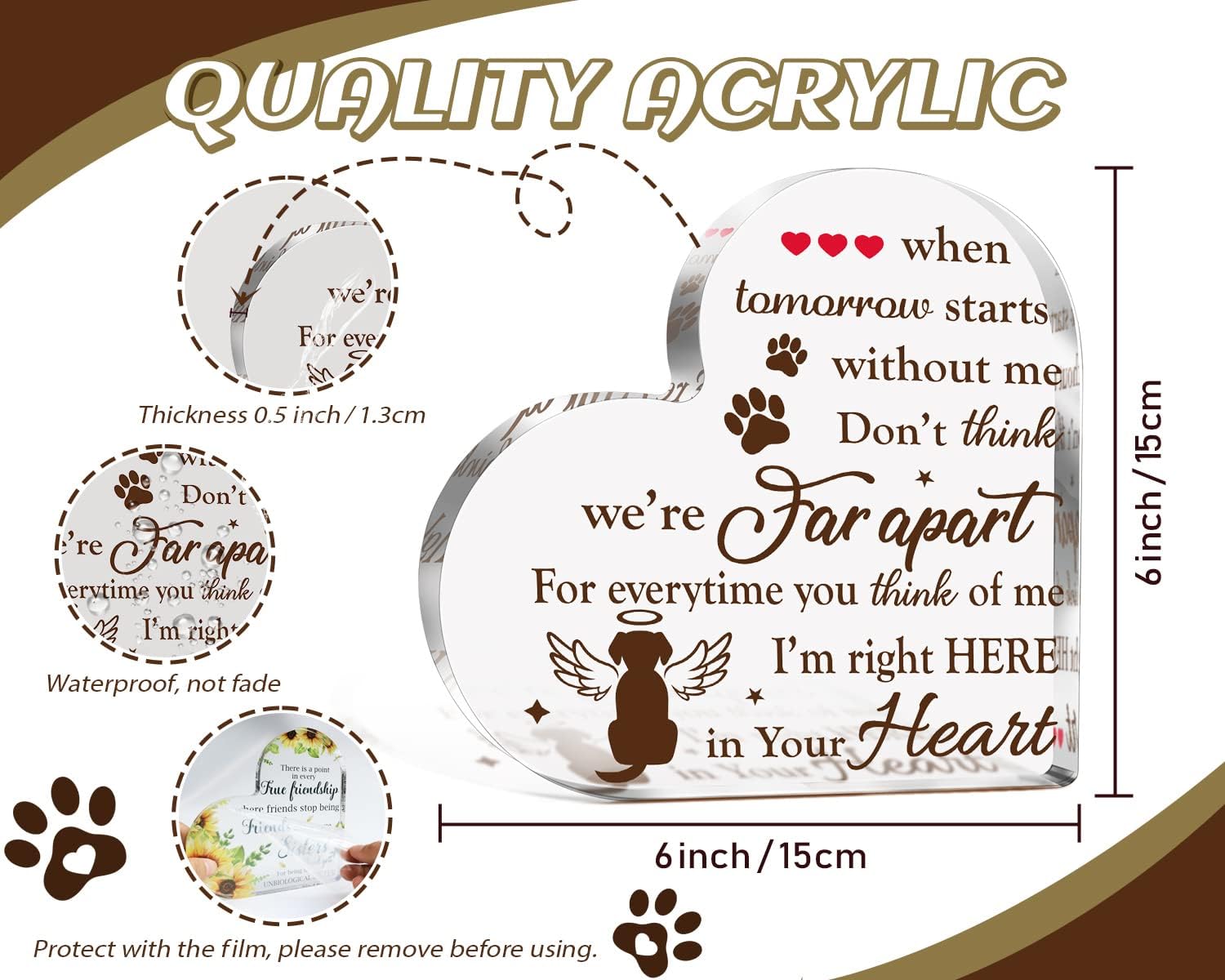- Delicate and Cute Design: The measures approximately 15 x 15 x 1.8 cm/6 x 6.3 x 0.7 inches. The gift features a delicate and cute heart-shaped design with printed pet paw prints, hearts, and a loving saying, "When tomorrow starts without me, don't think we are far apart, for every time you think of me, I'm right here in your heart".