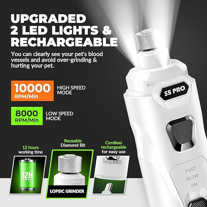 - 【Improved Precision: 2 LED Lights & Adjustable Speeds】: LOPSIC dog nail grinder for dogs features 2 LED lights that offer clear visibility of the quick, ensuring precise and safe nail trimming for your pets. The adjustable speeds(8,000 RPM to 10,000 RPM) of dog nail trimmers can adapt to small, medium and large pets nail trimming needs. When using the dog nail trimmers at the proper speed, pet nails of different hardness can be efficiently ground