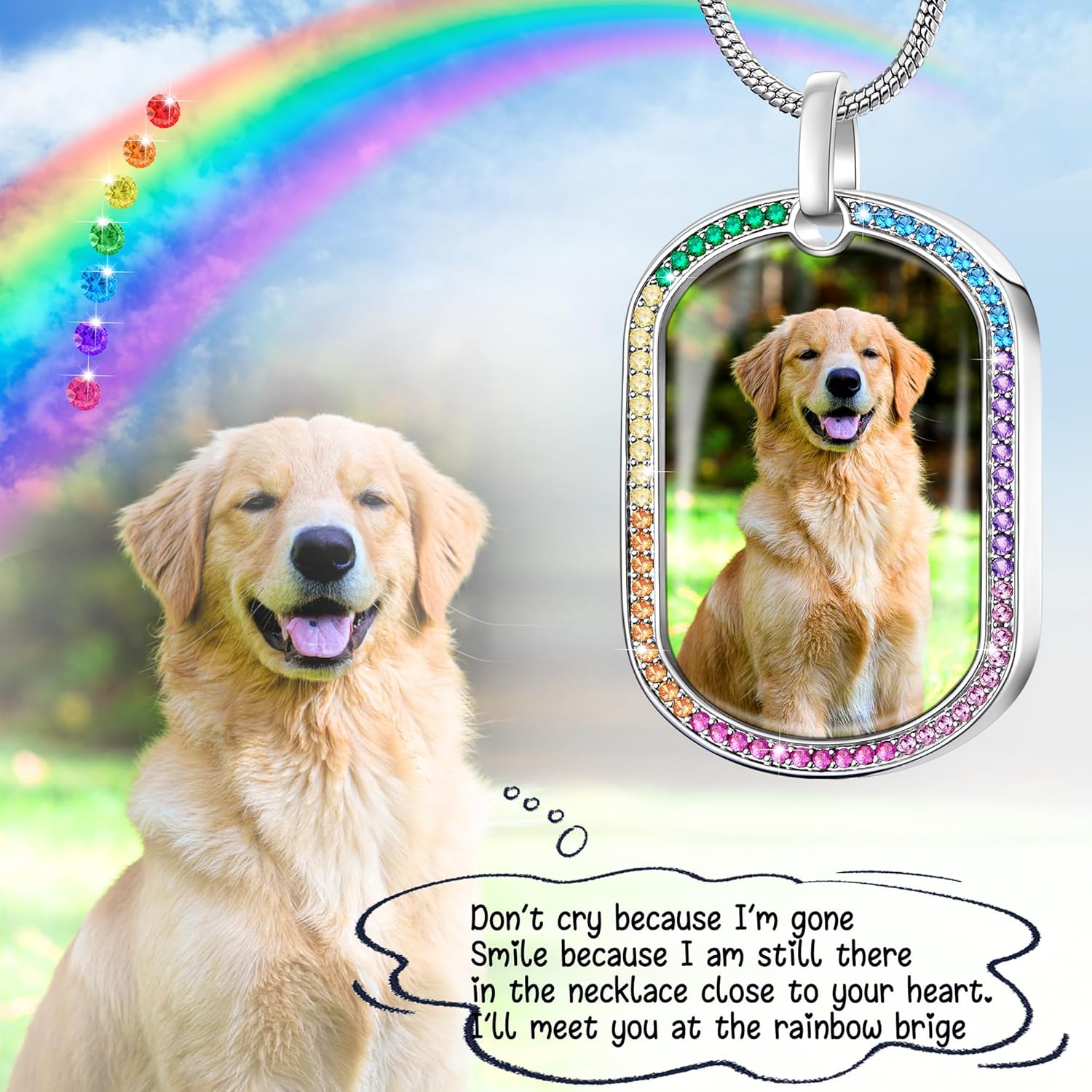 - Rainbow Bridge Memorial Necklace: Our dog ashes necklace features rainbow bridge zircon inlay. This design not only helps guide your beloved pet safely to the rainbow bridge. Whether it’s a loss of dog sympathy gift or a way to honor your furry friend, the zircon-embellished tag holds deep meaning, fitting for pet memorial gifts for dogs and comforting those grieving a dog passing away