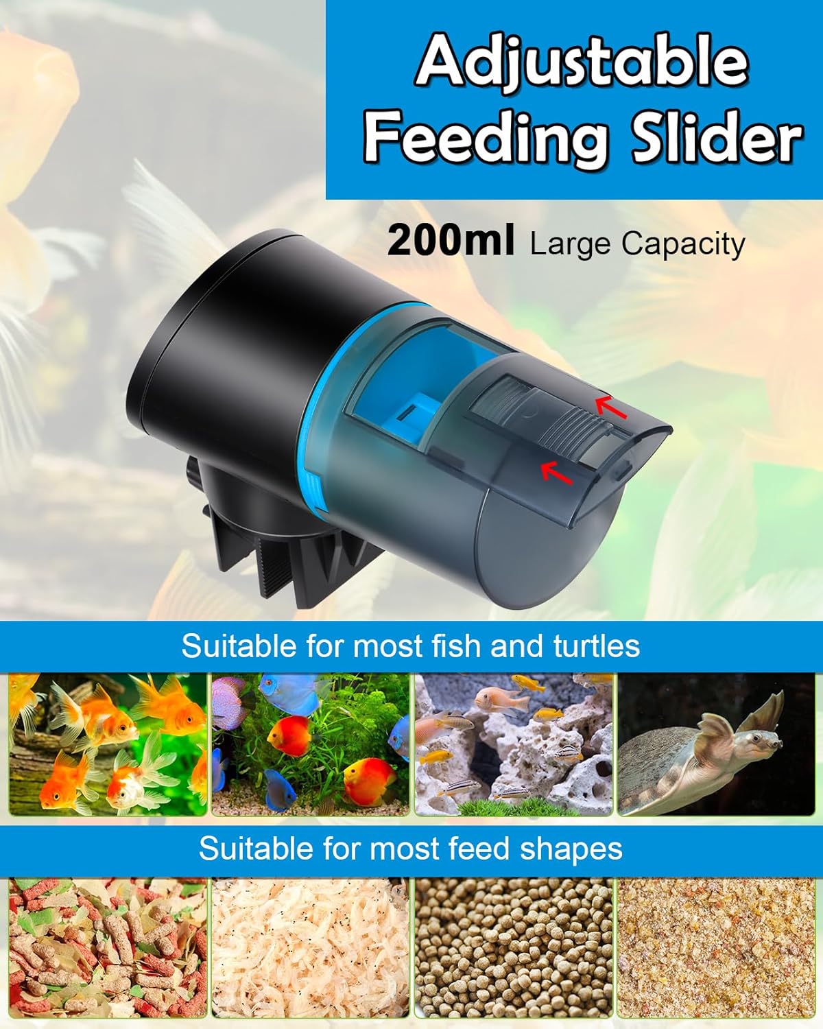 - Large capacity: 200ml large-capacity feed bucket fish feeder automatic dispenser, suitable for a variety of fish feed such as granules and powders