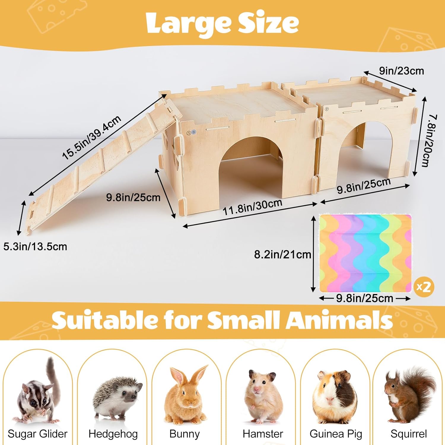 - Extra Large Size: The bigger house measures 11.8 x 9.8 x 7.8 in after installation, and the smaller house measures 9.8 x 9 x 7.8 in after installation; Enough space for guinea pigs, bunnies, chinchillas, ferrets and various small animals