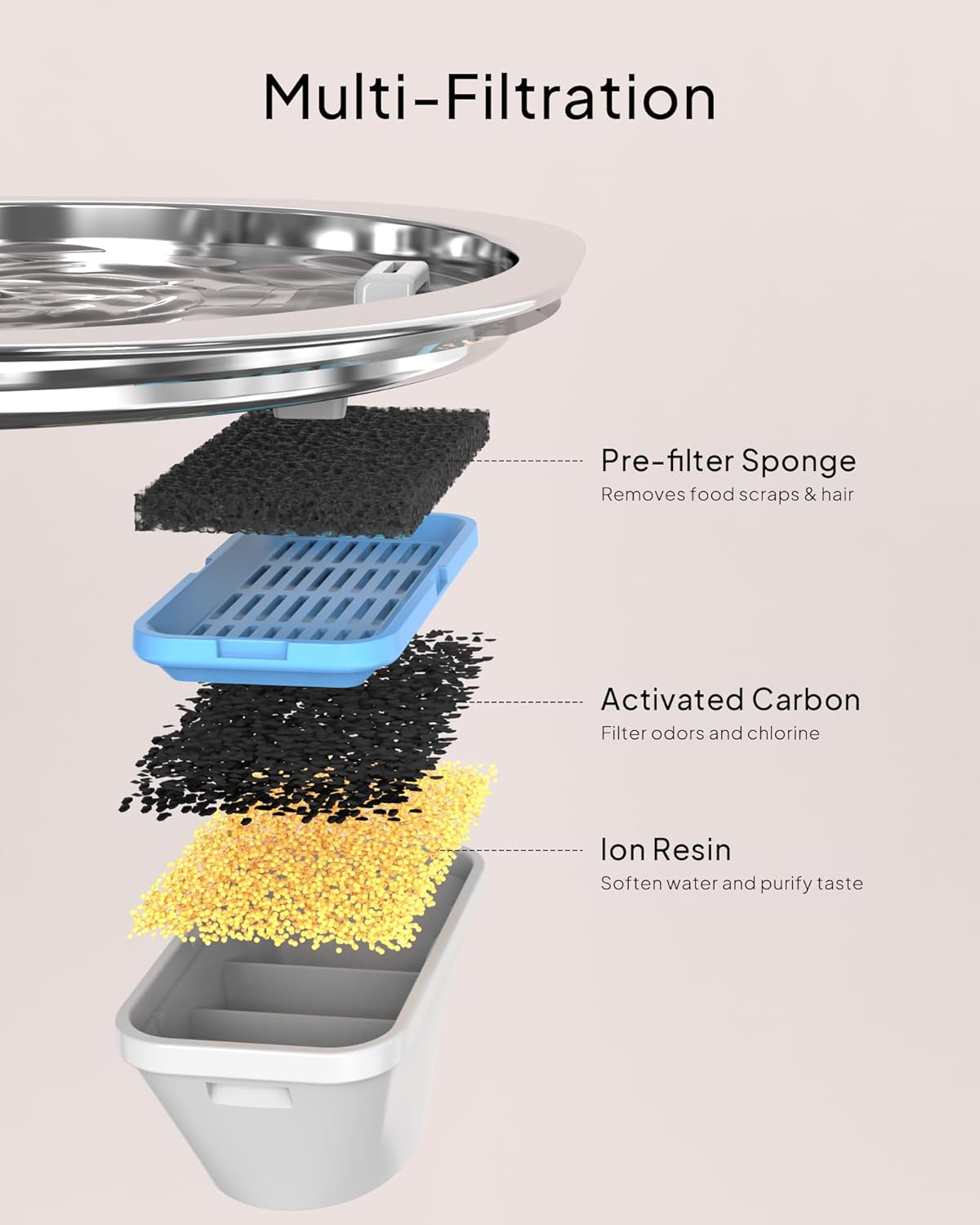 - Replaceable Filters for Clean Water: Equipped with pre-sponge filtration, along with activated carbon and ionic resin, our fountain ensures your cat drinks only clean, filtered water, free from impurities and odors.Please replace filters every 2-4 weeks