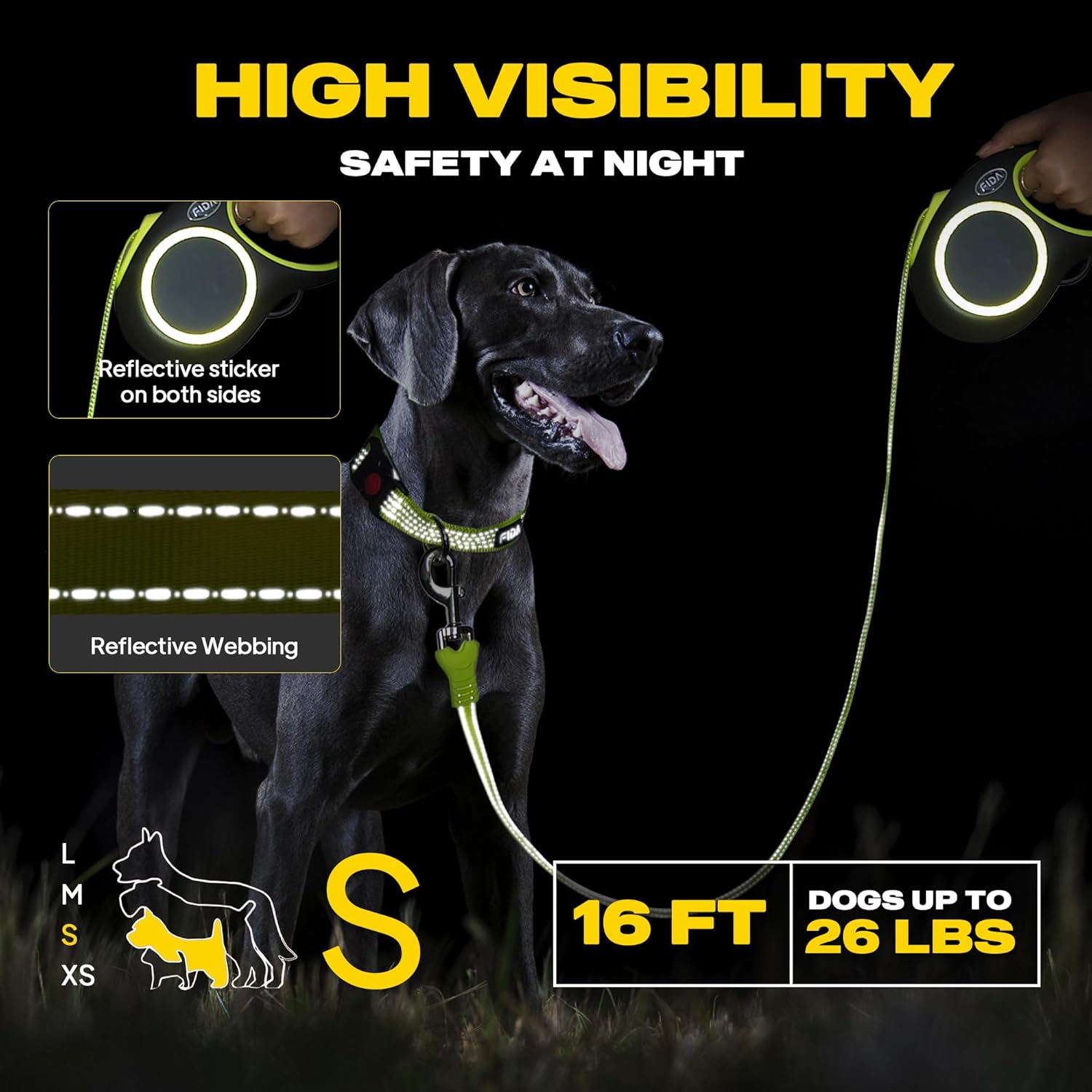 Fida Retractable Dog Leash, Reflective 16ft Heavy Duty Pet Walking Leash for Small/Medium Dog up to 26 lbs, Tangle Free. One-Hand Brake (Small, Neon Yellow)