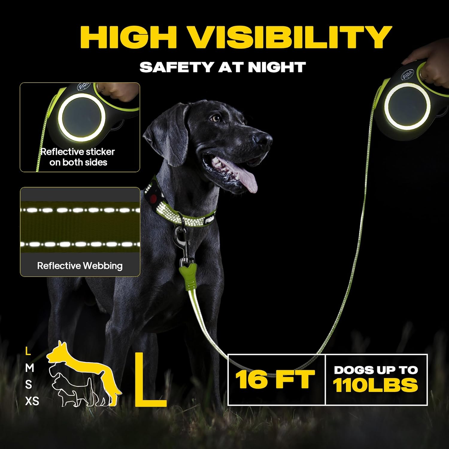 Fida Retractable Dog Leash, Reflective 16ft Heavy Duty Pet Walking Leash for Medium/Large Dog up to 110 lbs, Tangle Free. One-Hand Brake (Large, Neon Yellow)
