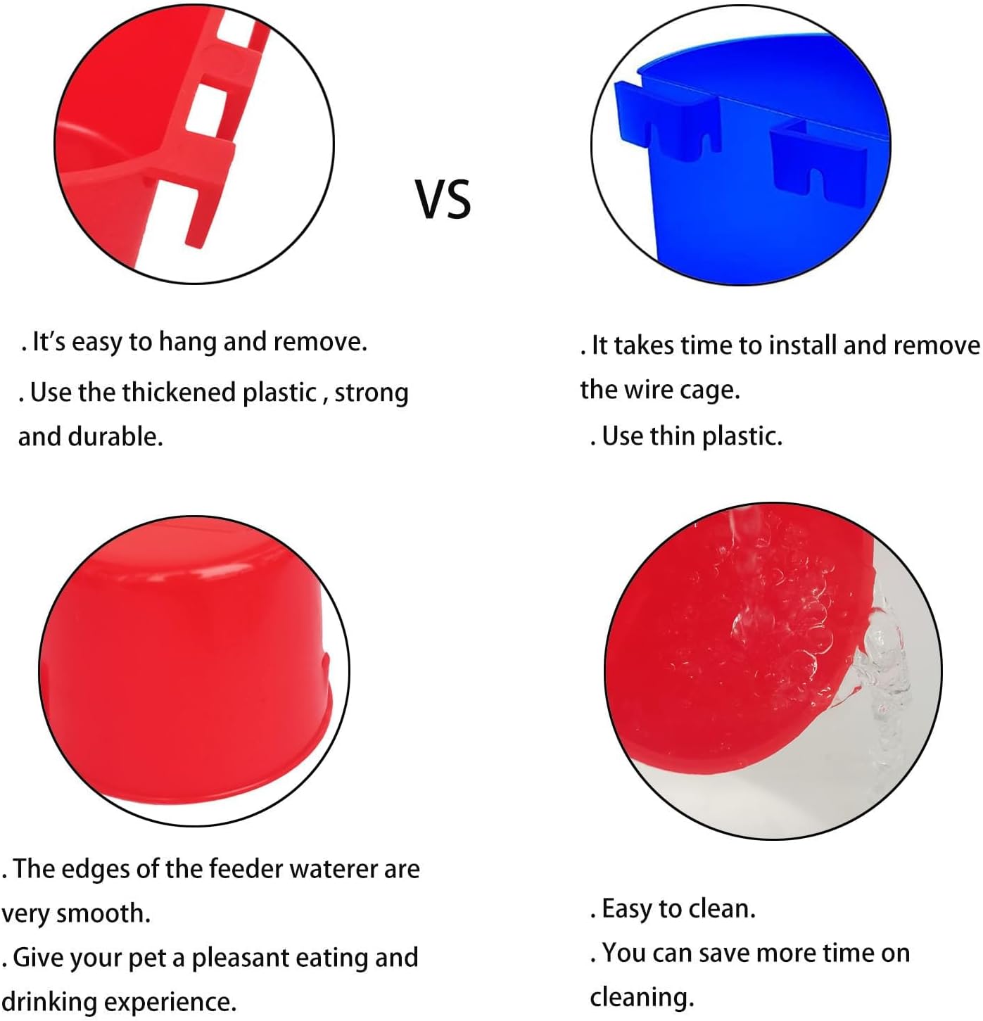 - 【High Quality】the material of bird seed food feeding cups is quality plastics, odorless, wear-resisting,durable. The edges of the pet bowl are smooth without burrs. Very safe for your birds, poultry,rabbit.chicken and small animals.