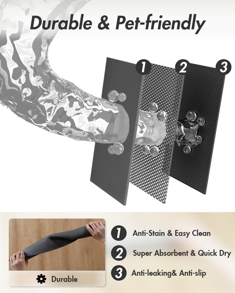 - Super Absorbent & No Stains: Special absorbent surface hide any messy stains completely. Magic pet food mat catch every drip off pets' chin around the pet water or food bowl. Prevent Say goodbye to spread stains and messy feeding area.