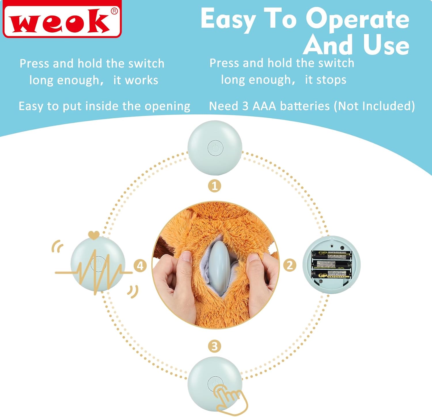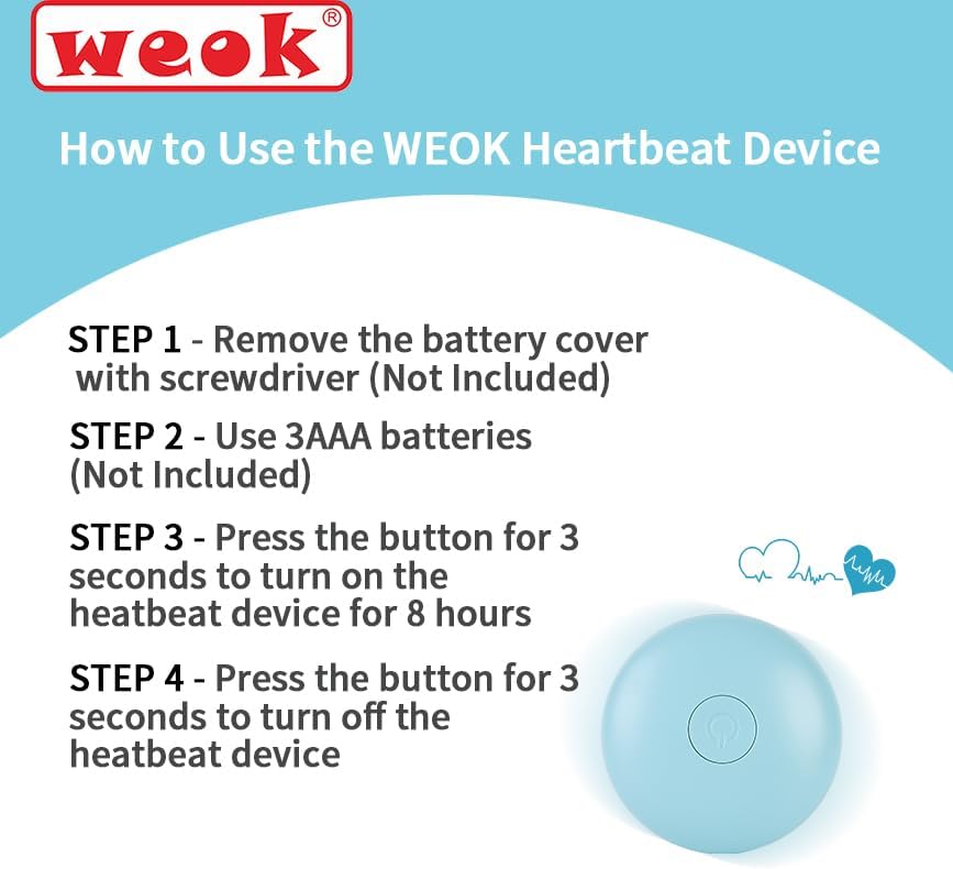 - 【Heartbeat Simulator Module + Plush Toy】The WEOK product contain a plush dog toy and a heartbeat simulator Module. The heartbeat Simulator need 3 AAA batteries(No battery included in the package). Press the button, then the heartbeat module works. Easy to operate.