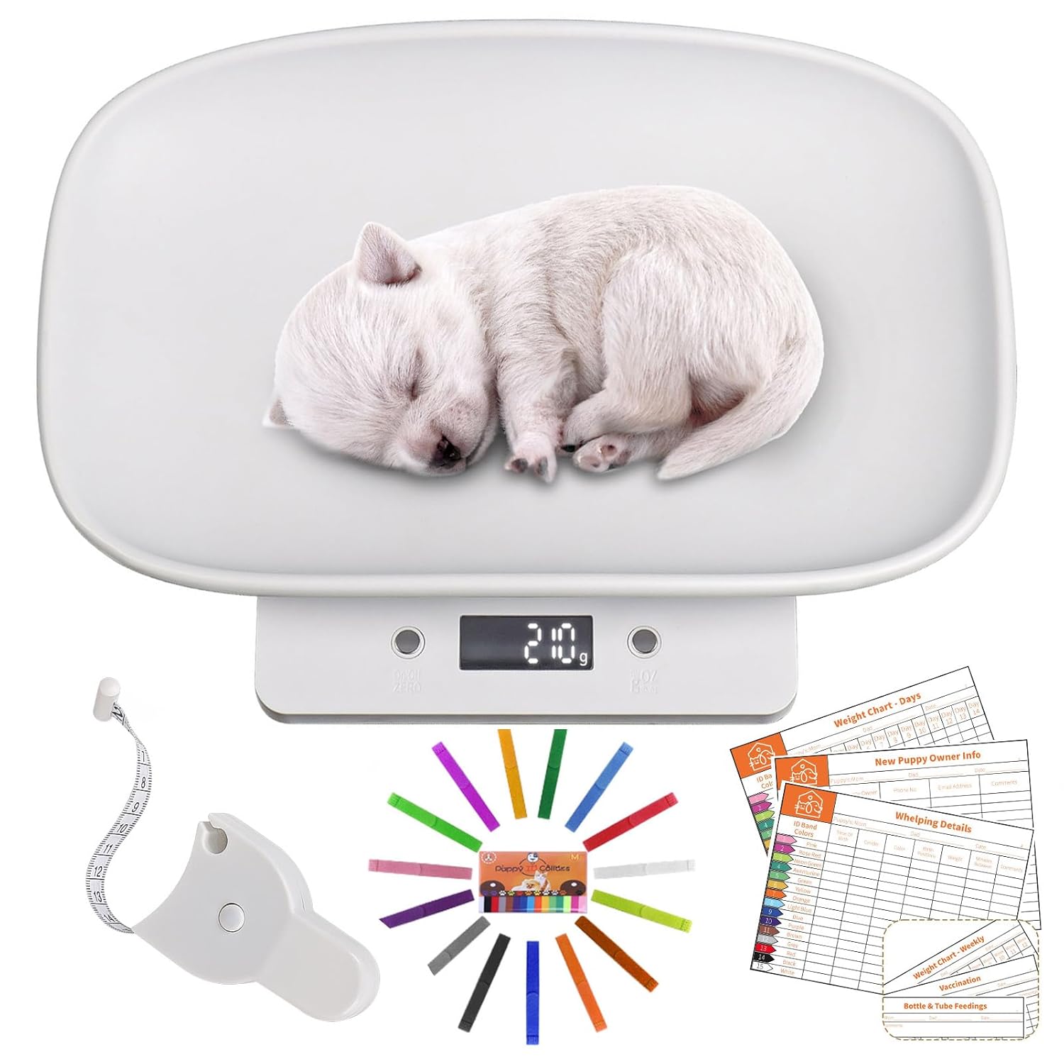 Digital Small Animals Scales for Weighing with Tape Measure, Puppy Whelping Scale Weigh Your Kitten, Rabbit with High Precision, Inclue 15 Color Newborn Puppy Collars and 6 Record Keeping Charts