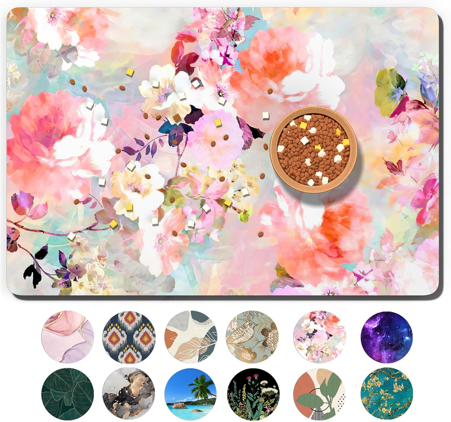 Dog Food Mat, 16" x 24" Flower Absorbent Dog Cat Bowl Mat for Food and Water, Cute Anti-Slip Rubber Pet Feeding Rug Protect Floors, Placemat for Feeding & Watering Supplies, Pink