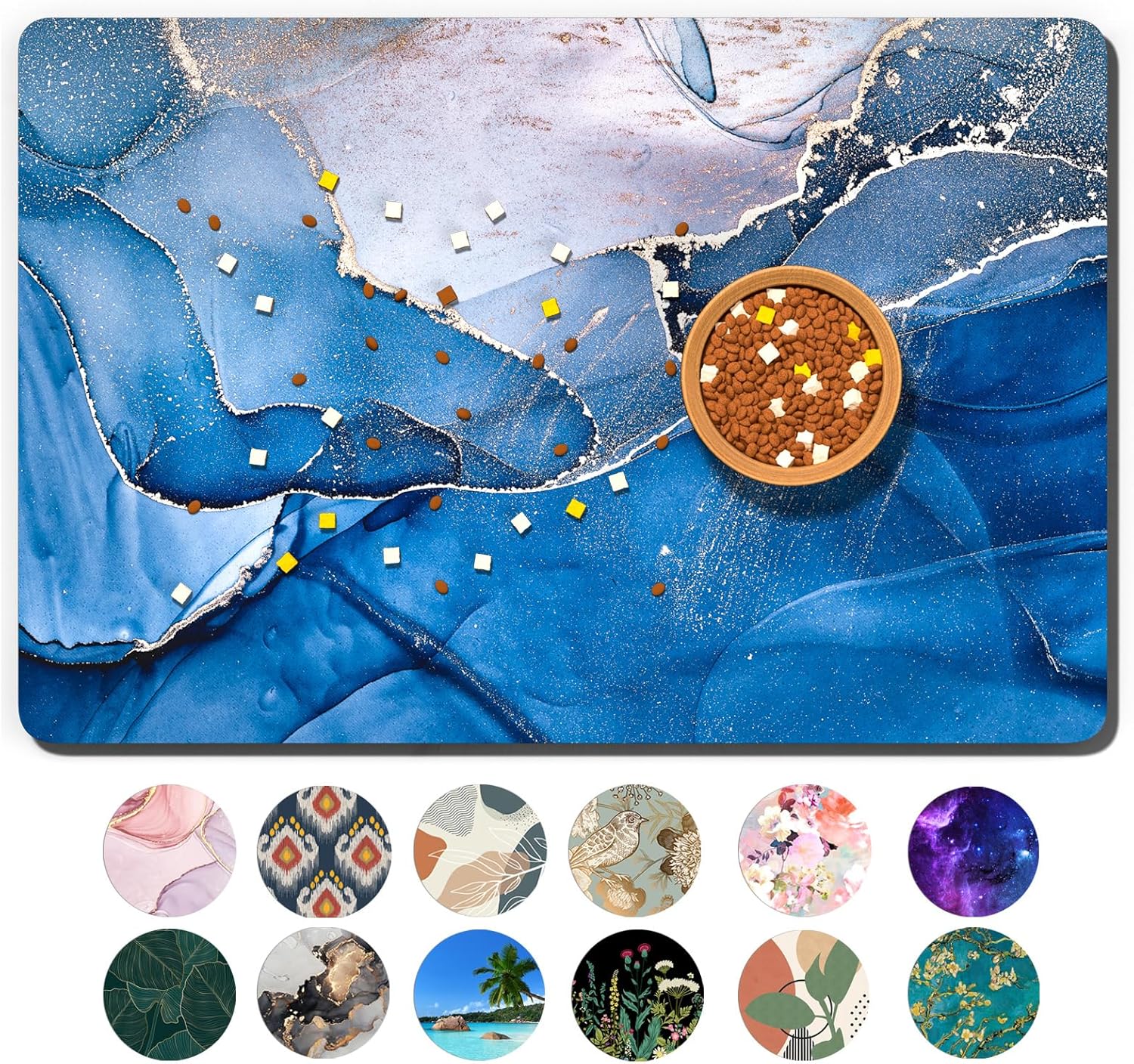Dog Food Mat, 16" x 24" Marble Absorbent Dog Cat Bowl Mat for Food and Water, Cute Anti-Slip Rubber Pet Feeding Rug Protect Floors, Placemat for Feeding & Watering Supplies, Navy