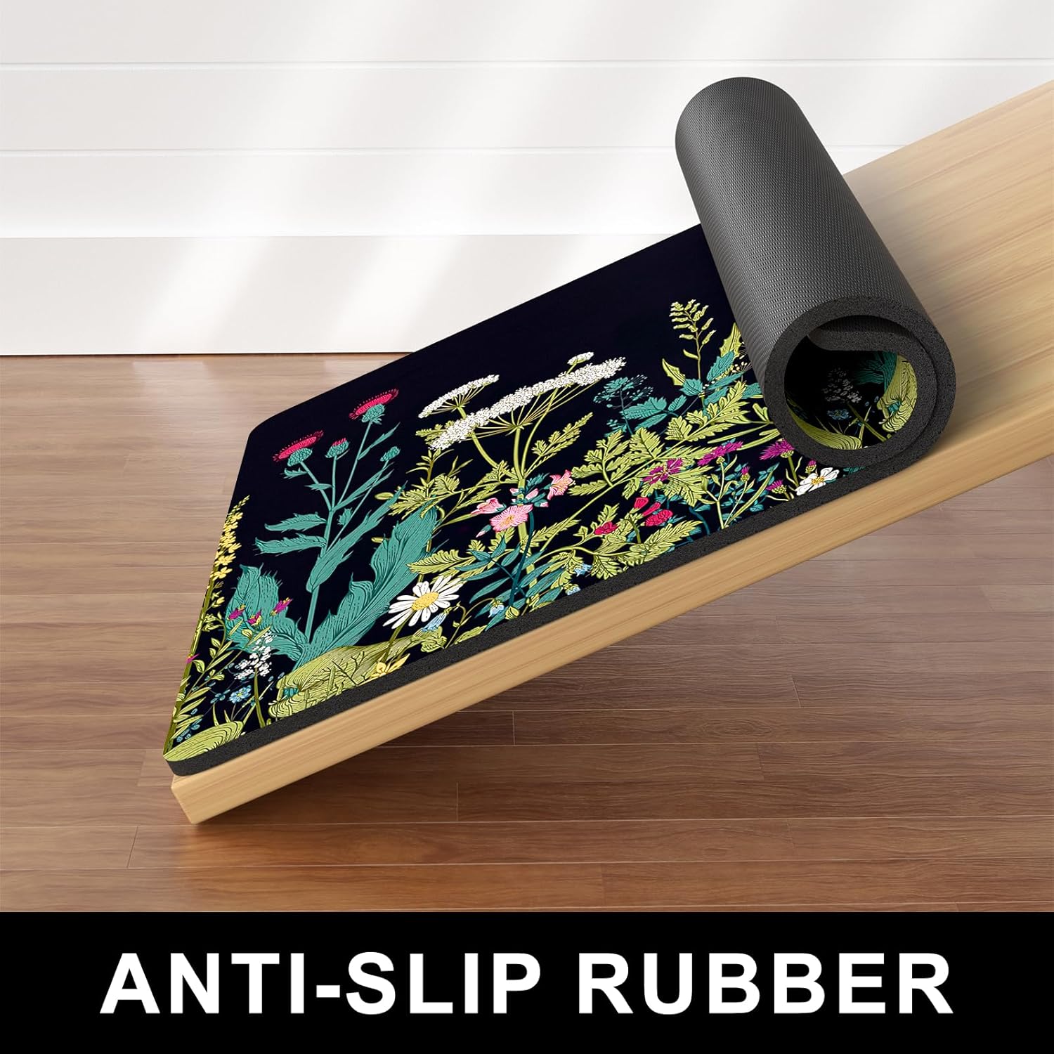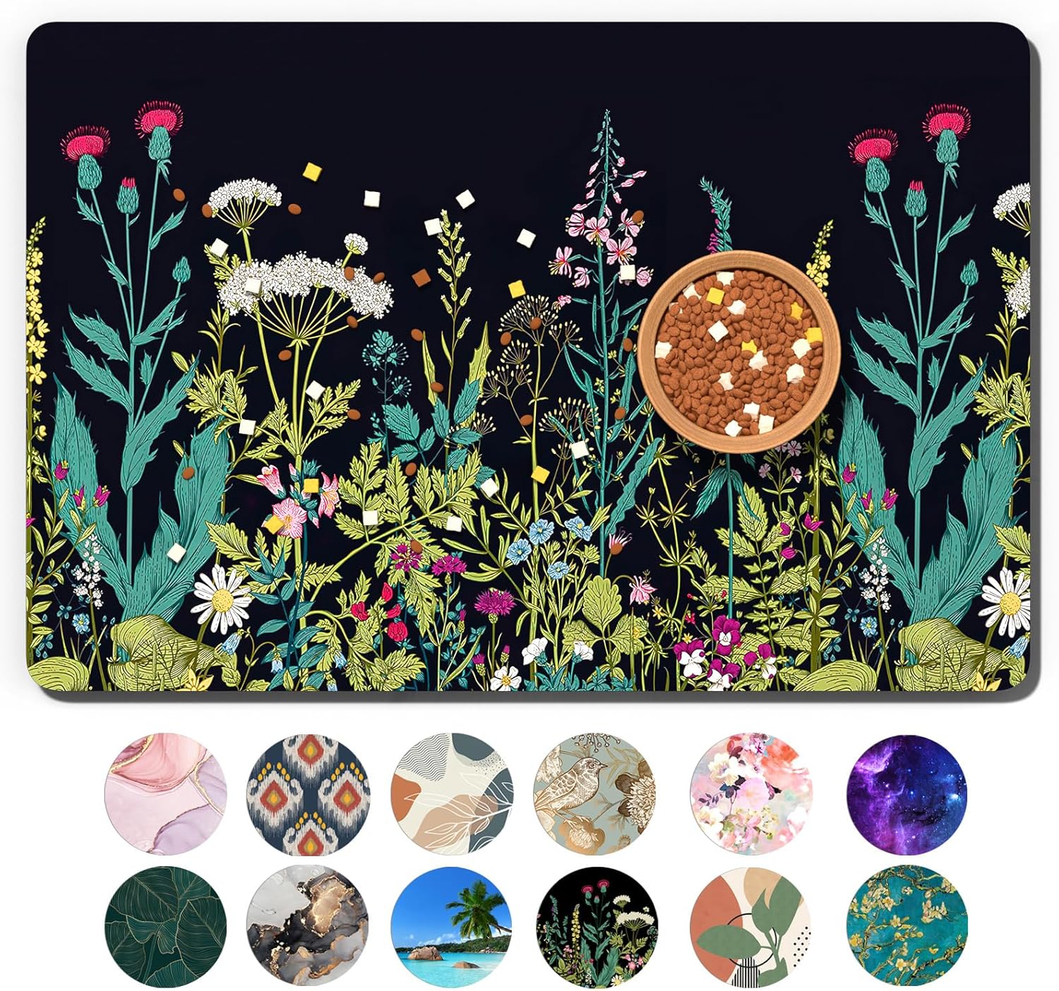 Dog Food Mat, 16" x 24" Absorbent Dog Cat Bowl Mat for Food and Water, Cute Anti-Slip Rubber Pet Feeding Rug Protect Floors, Placemat for Feeding & Watering Supplies, Midnight Flower