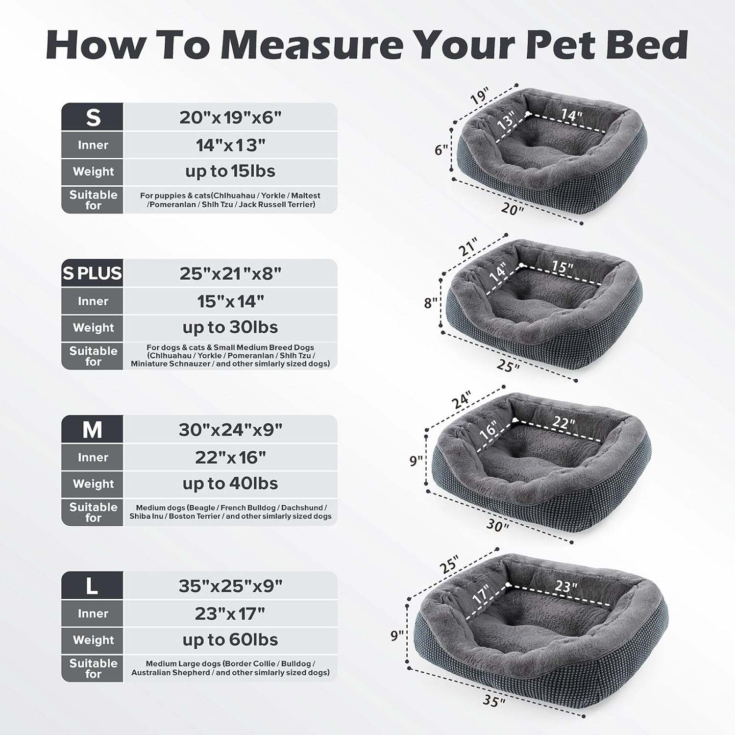 - 🐶SIZE DETAILS: Small dog bed for Small dogs or cats up to 15lbs, the outer size is 20"x19"x6"; Small Medium dog bed for pets up to 30lbs, the outer size is 25"x21"x8"; Medium dog bed for Medium dogs up to 40lbs, the outer size is 30"x24"x9"; Large dog bed for large dogs up to 60lbs, the outer size is 35"x25"x9"; Please be sure to confirm the size.