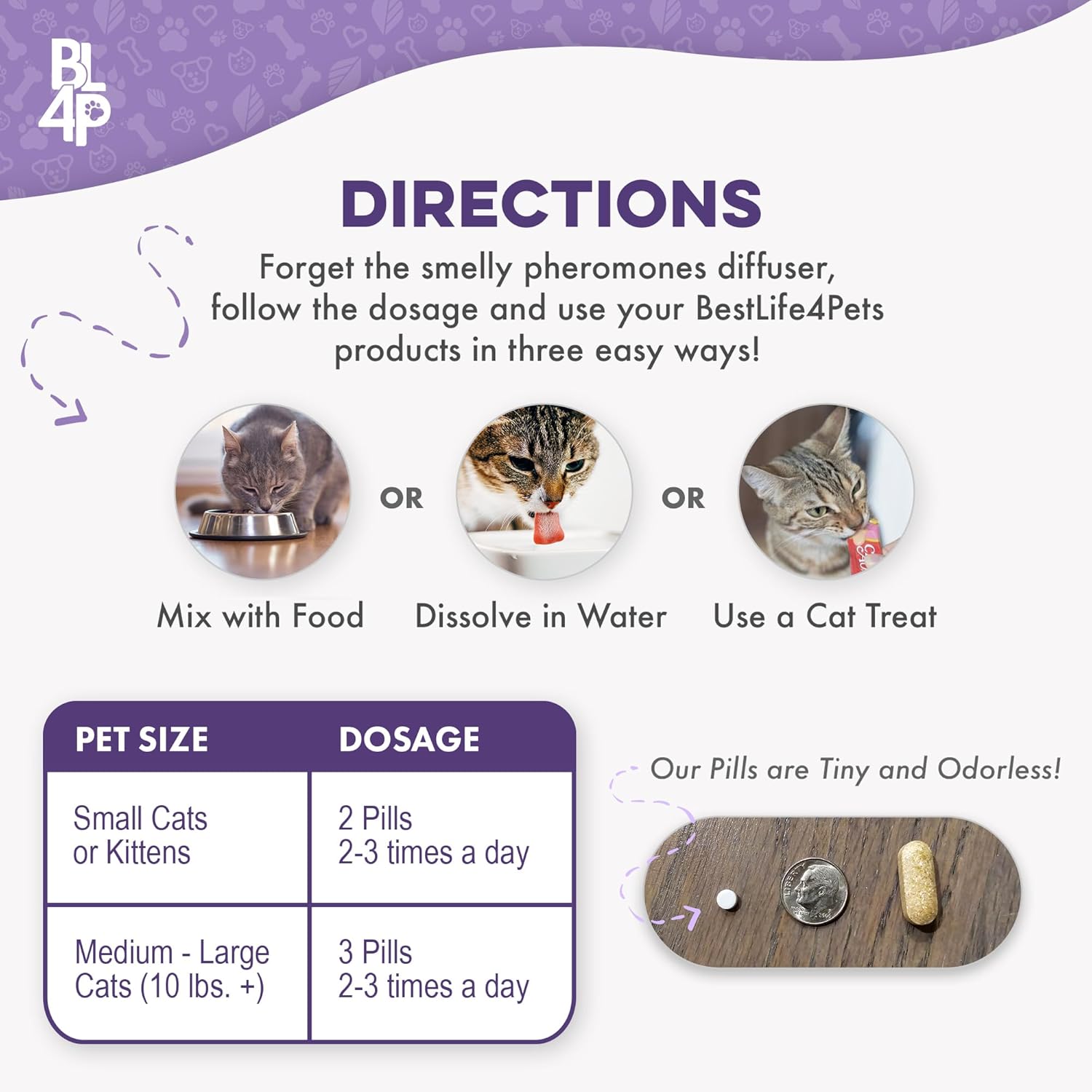- No Fuss, Easy to Give: Stop struggling with smelly sprays and chews or uncomfortable collars, our tiny, odorless, and tasteless cat calming pills are made to be easily hidden in treats, a pill pocket, added to wet or dry food, or even crushed into powder and dissolved in water, making administration stress-free for both you and your fussy feline.