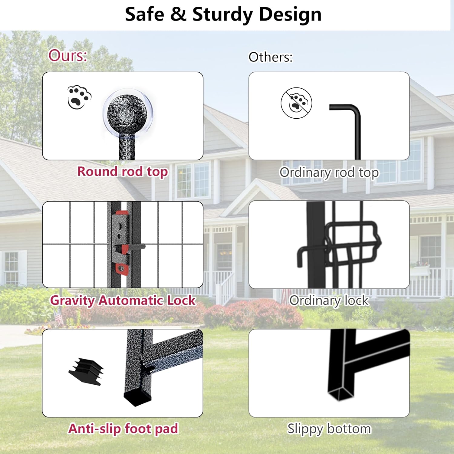 - 【Safe & Upgraded Design】: Jhsomdr puppy play pen upgraded with automatic door lock is firm and prevents pets from escaping; Metal round-top rods are designed round ball top and elongated bottom, effectively protecting pet claws, and pounded into the ground for greater stability. The bottom of our pet fence is designed with anti-slip foot pads and flat stakes, also suitable for indoor use without scratching indoor floor