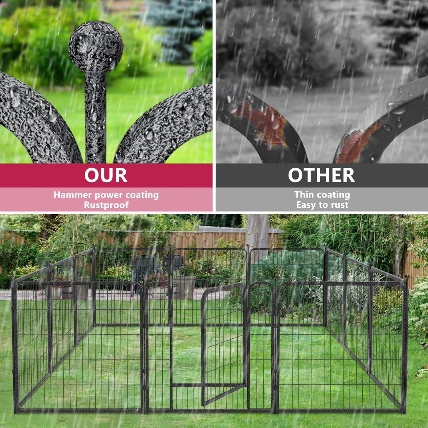 - 【Heavy Duty Metal Construction】: Jhsomdr dog playpen is made of heavy duty metal, with thickened steel wire panels, prevents dogs from chewing or tearing and push over the outdoor dog fence. The double-layer coating finish is rust-proof and waterproof, make the metal dog play pen suitable for outside use