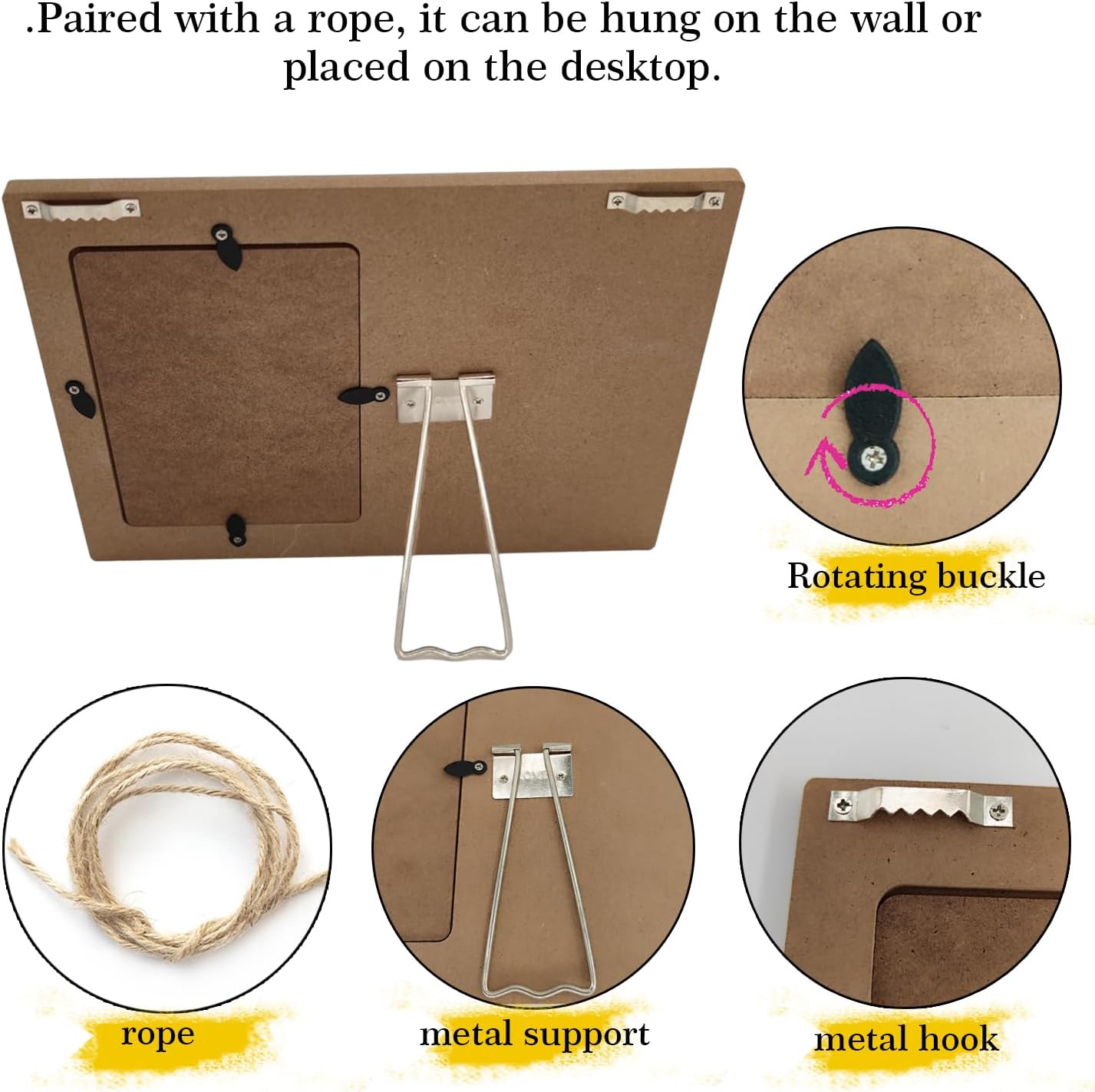 - Back stand easel for table display.Wall-hanging clips for wall mounting.picture frame curved beveled edges.