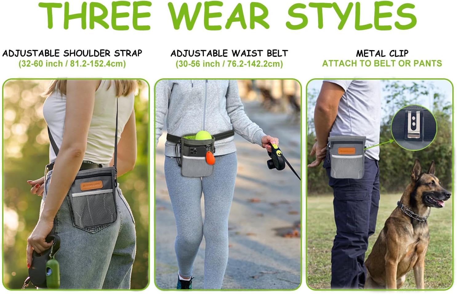 - 3 WAYS TO WEAR – Our dog treat pouches for pet training can be worn around the waist, crossbody, or clipped to your belt or pants. No matter your preference, you can train your dog hands-free and distraction-free.