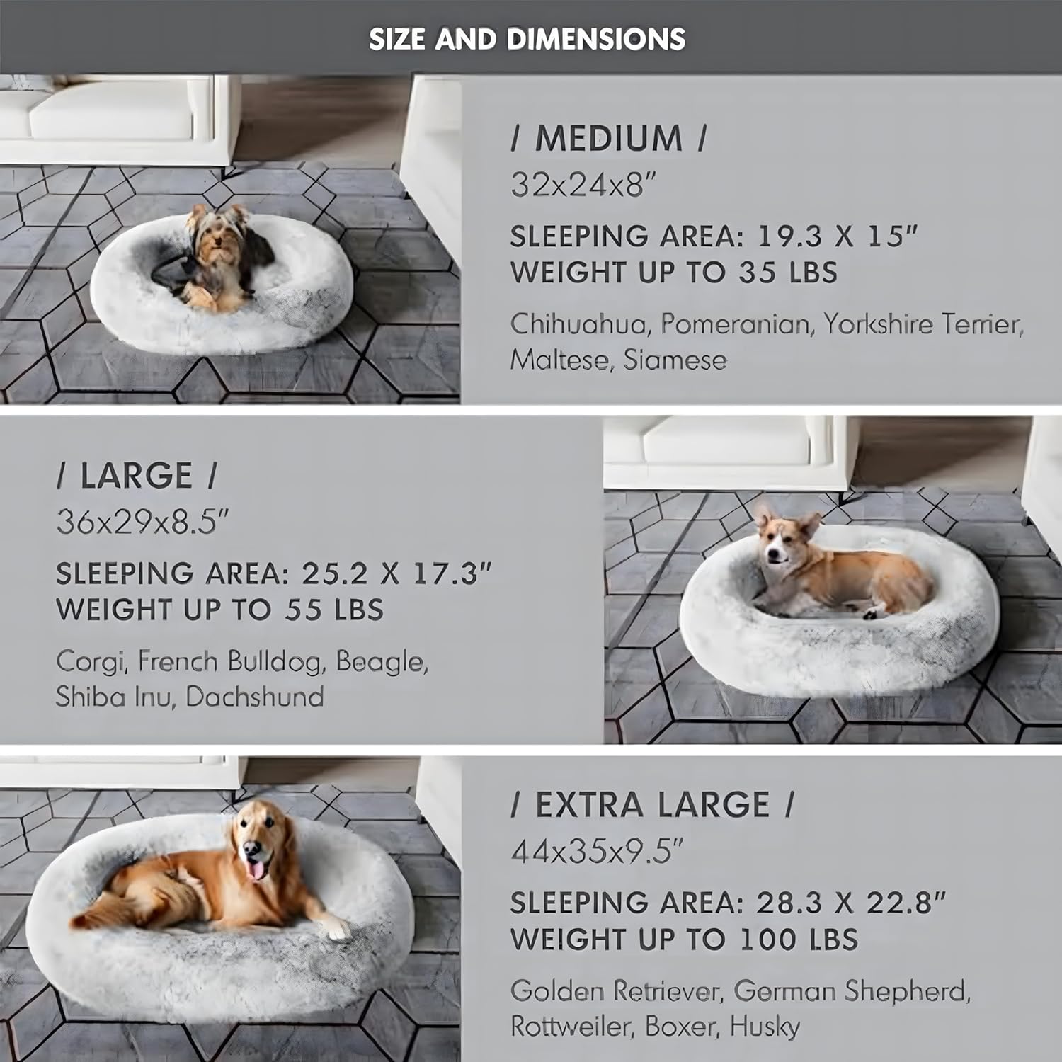 - Excellent Support: This donut dog bed is perfect for pets that like to curl up. The raised edges are filled with shredded foam, which allows your pets to easily rest their heads. This is beneficial for spine and joint health. Additionally, the bed is equipped with high-density foam on the bottom, improving comfort and preventing pets from lying directly on the floor