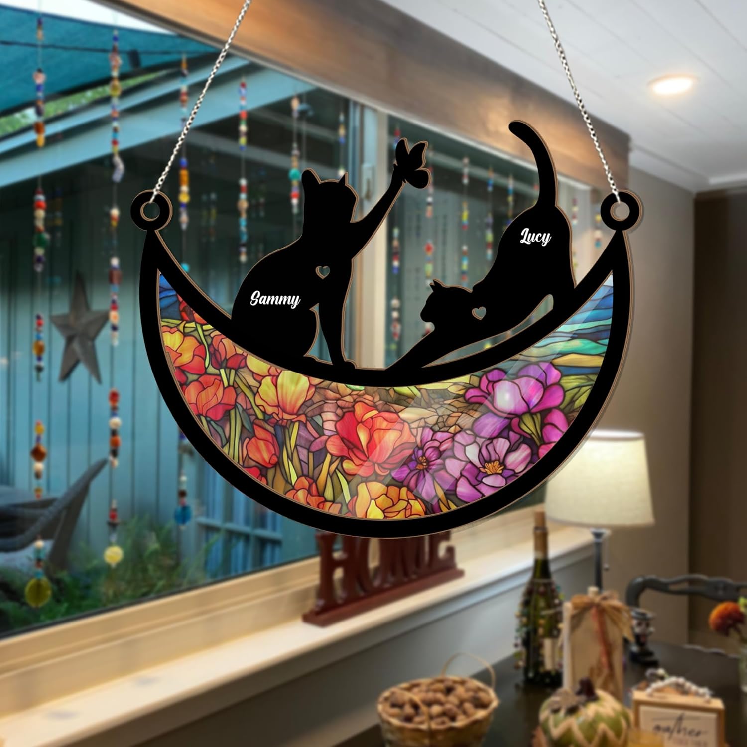 Personalized Couple Cat Suncatcher - Couple Pet On Moon Window Hanging, Loss of Pet Sympathy Gift, Furry Friends Keepsake, Engraved Cat Lovers, Remembrance Gifts