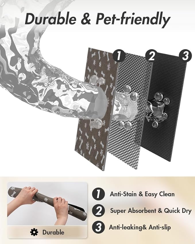 - 【Anti-Leakage & Anti-Slip】Equipped with a 100% non-slip rubber backing, this dog mat for food and water stays in place even on wet floors. The rubber base prevents leaks, keeping your floors protected and your pet's paws dry. Ideal for both dog and cat food mats, this feature ensures a secure and mess-free feeding experience