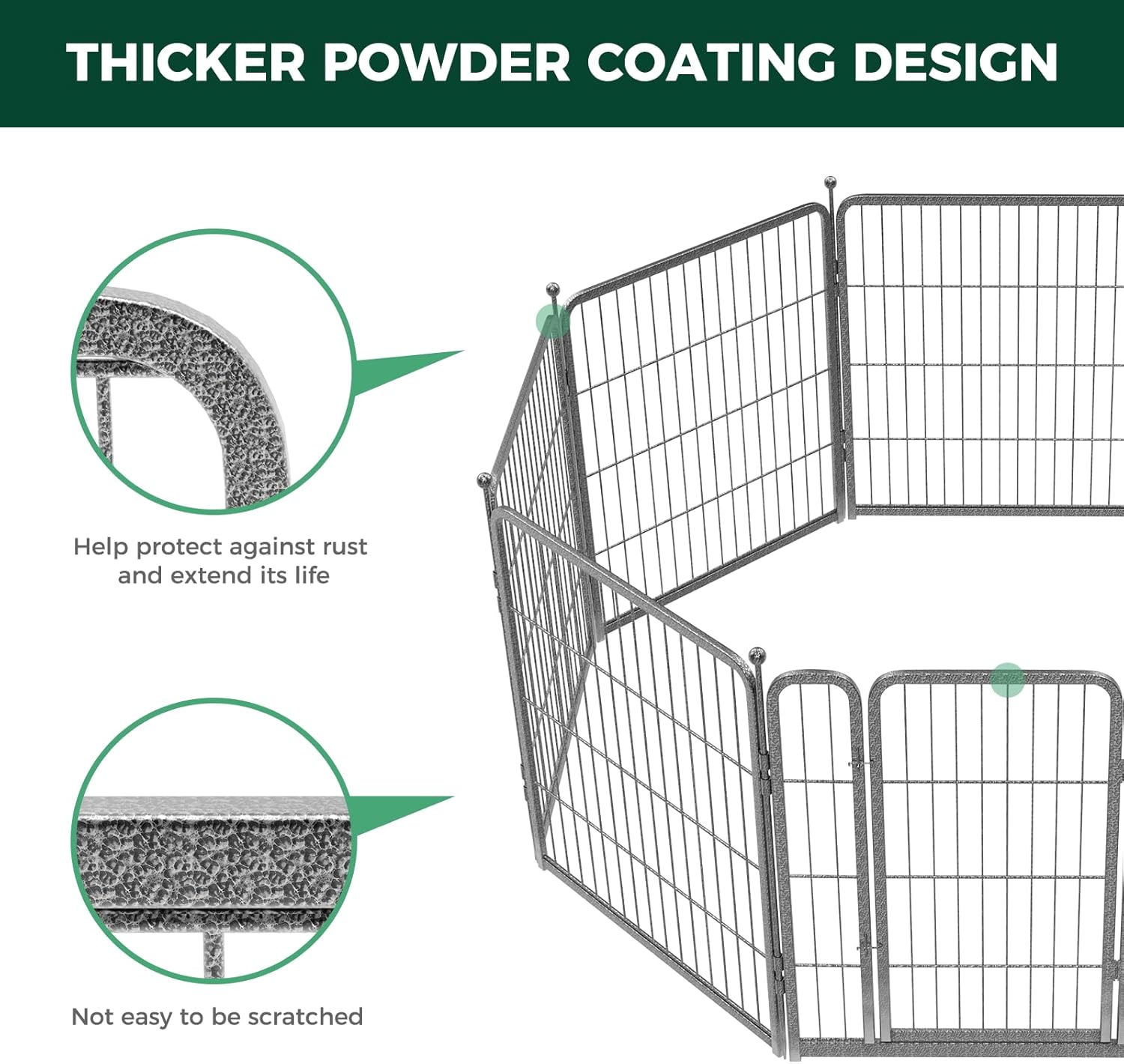 - Thicker Powder Coating: Our outdoor dog pens feature a thicker, silver powder coating designed to enhance durability and resist scratches. This robust coating ensures the pen withstands the varied conditions of garden environments, extending its lifespan and reducing the need for frequent replacements. Enjoy a more durable and long-lasting experience with your dog in the beauty of your garden.