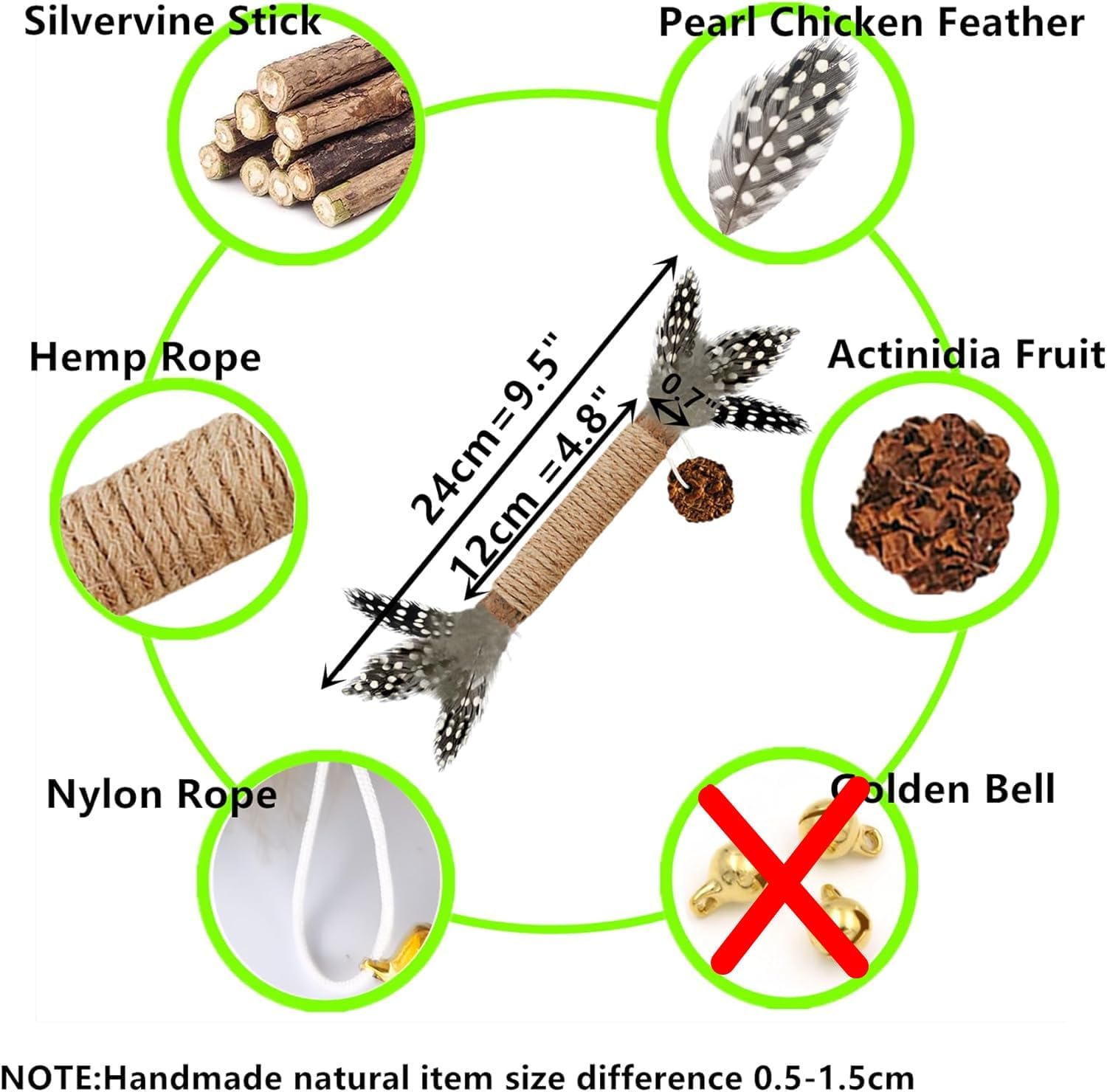 - 1.[Upgraded 5 in 1 Cat Toys]:Cat chew toy for kitten is designed for cat health problem by“5 semsings”.SMELL of twisted catnip hemp rope; VISION of natural handmade silvervine stick for cat; TOUCH of real & nice chicken feather; TASTE of organic matatabi fruit. Cat feather toy can prevent various problems:oral cavity, indigestion,trichomadesis, excessive obesity and pressure. You & your cat need cat teaser toy badly!