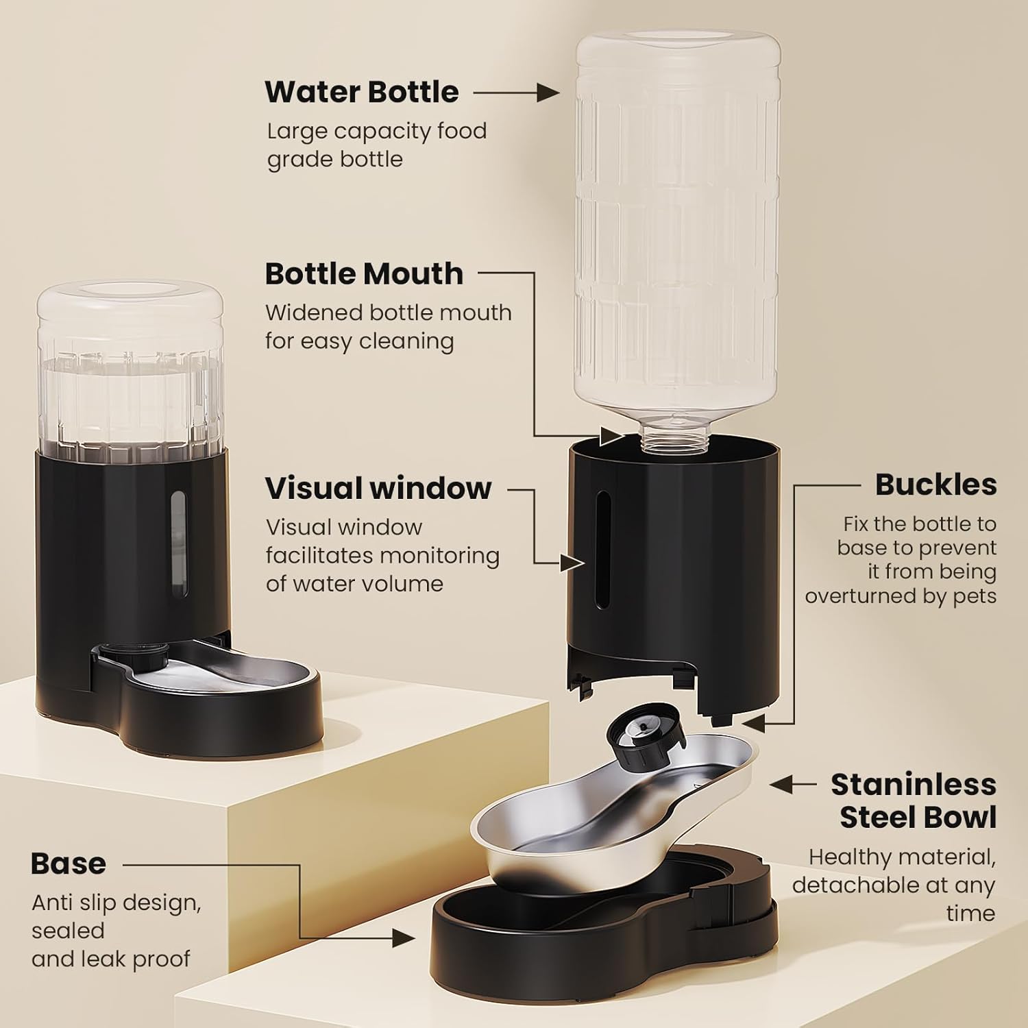 - [Drinking Safe] We take care of pets' drinking water health. The water bowl is fully attached to the base and made of food grade 304 stainless steel. Other components also use pet friendly materials.