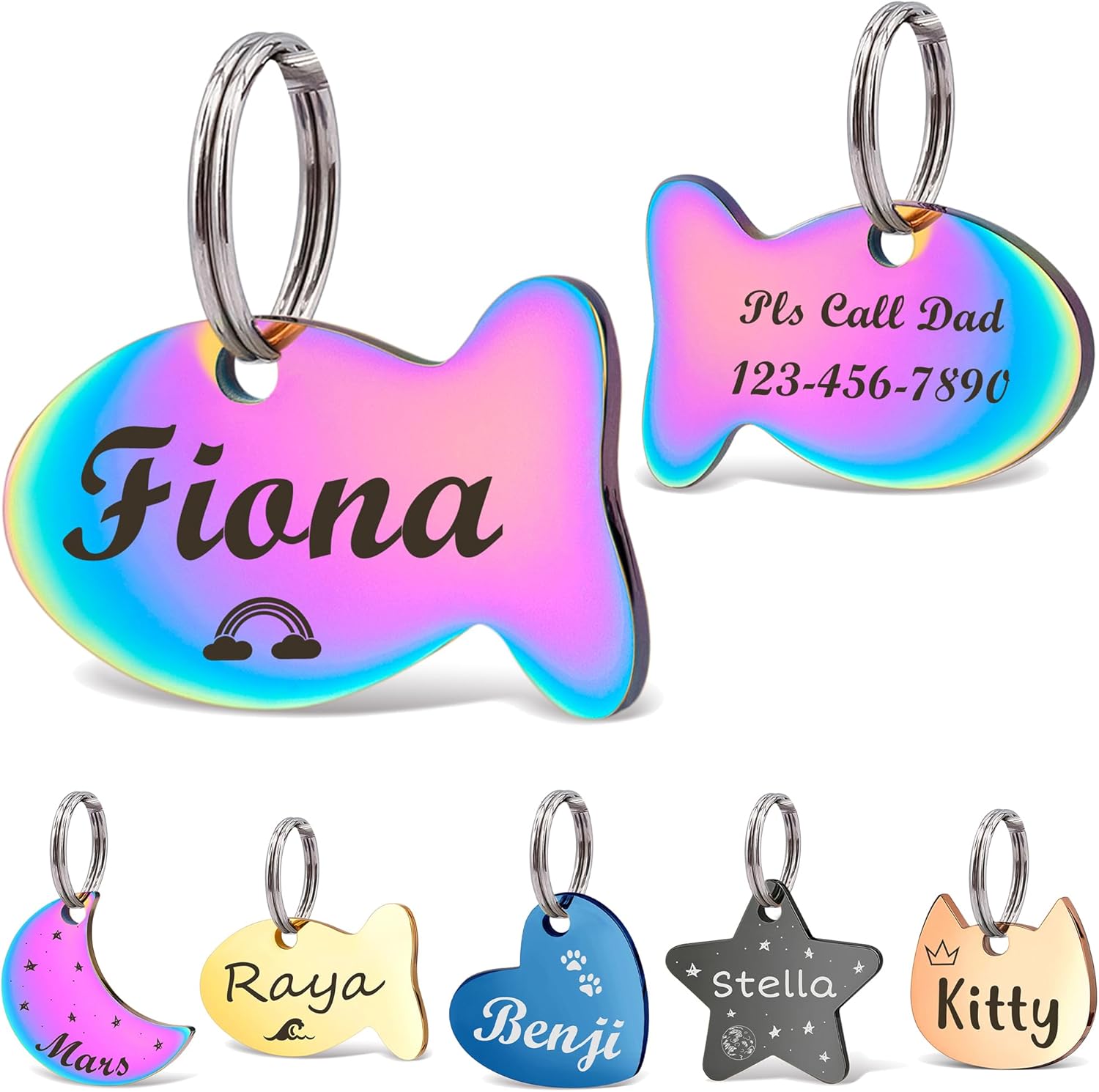 Anavia Small Size Dog Cat ID Tags, Small/XS Personalized Color Plated Stainless Steel Puppy Kitten Name Tags, Customized Engraved Nameplate Pet Collar Tag (Rainbow, Fish)