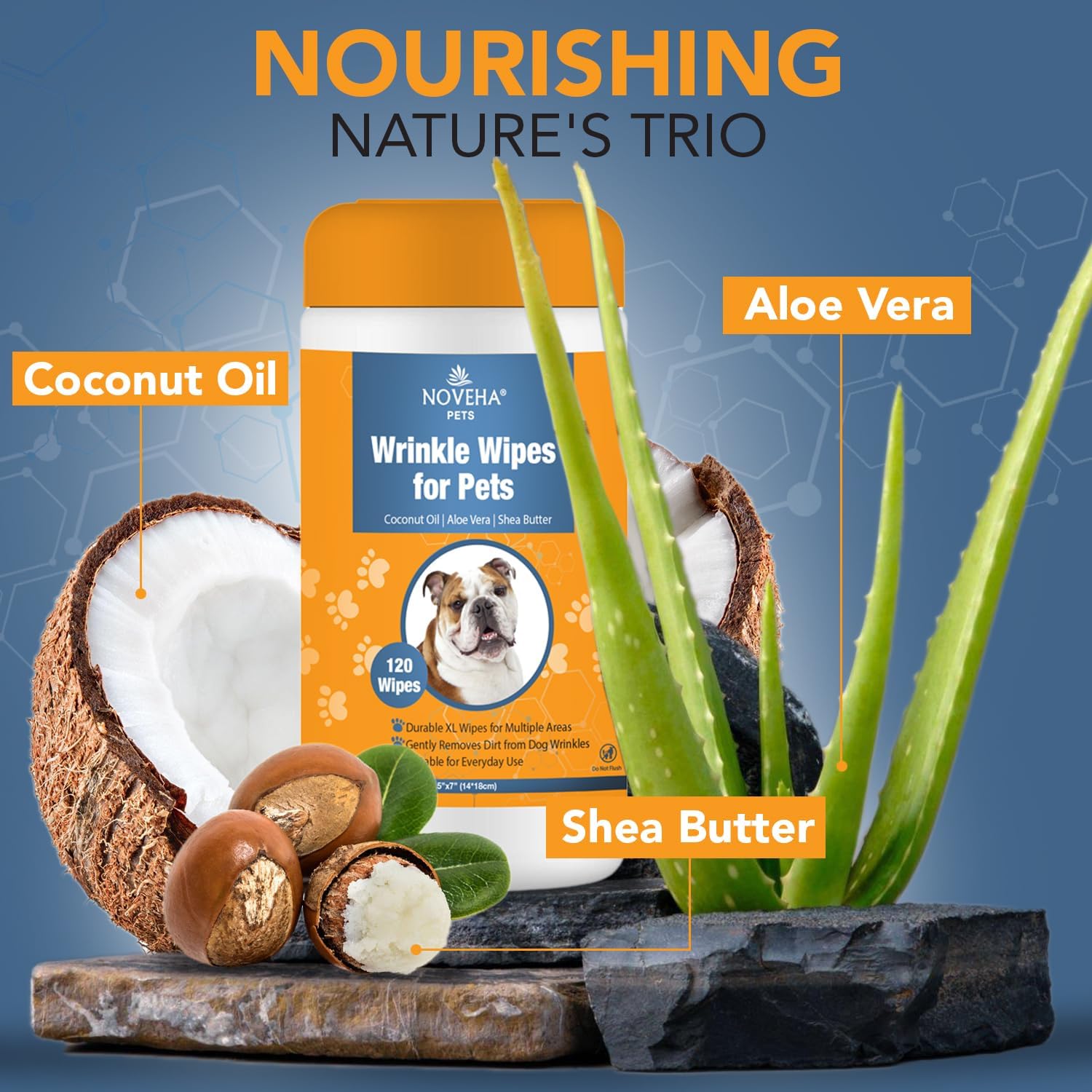 NOVEHA 120PCs - 5โx7โ Large Dog Wipes | Wipes for Bulldog, French Bulldog, Pug, English Bulldog | Deodorizing, for Multiple Areas Removes Dirt, Wrinkles, Folds, Tear Stain, Tail Pockets & Paws