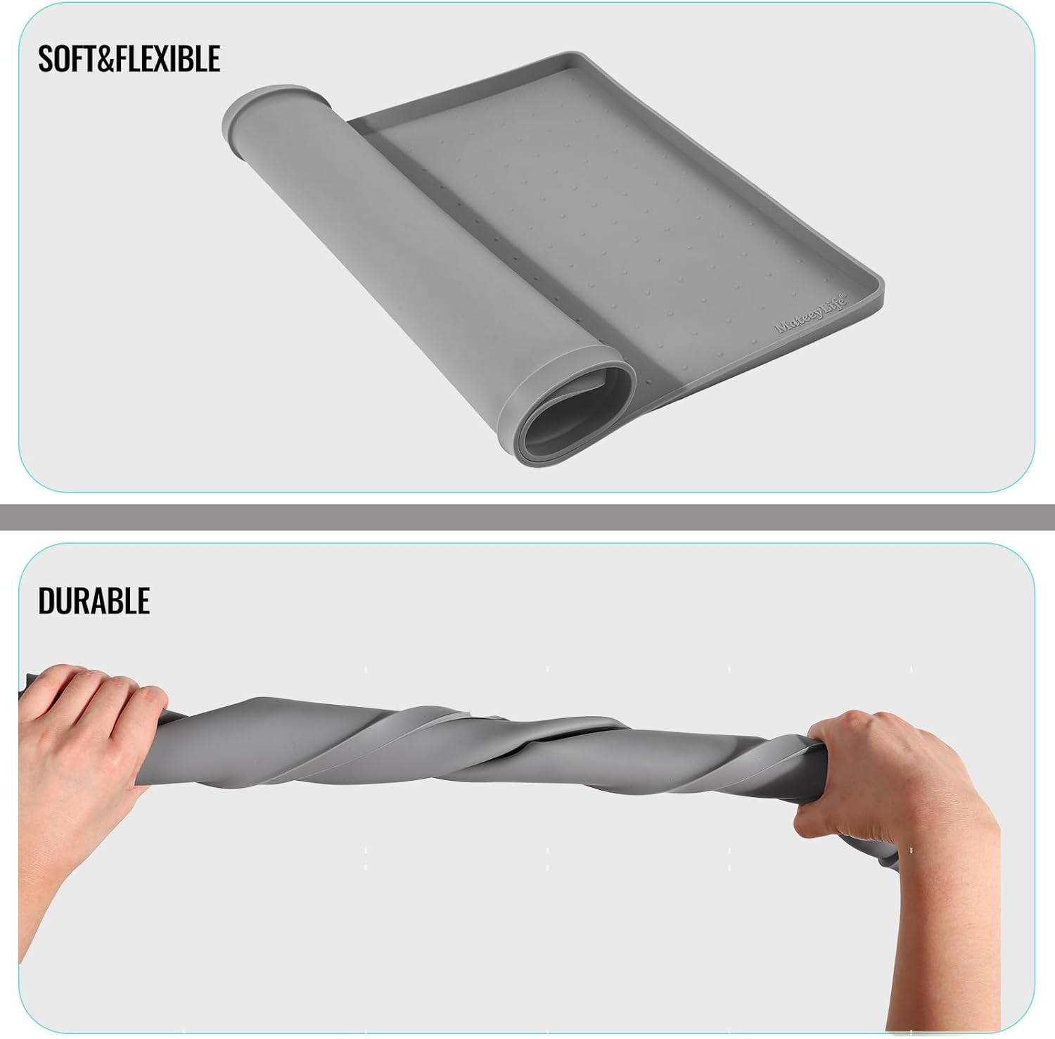 - Food-Grade Silicone Material: Made of BPA-free and food-grade silicone, our silicone dog mats for food and water bowls, silicone pet mats for floor waterproof and silicon mat for under dog crate are completely safe for your puppy. Flexible silicone makes a small rubber mat for dog bowls to roll up easily and store in a drawer or corner when not in use. Lightweight also makes you feel free to carry when traveling. Our dog mats for floors came rolled up, but they laid perfectly flat when opened