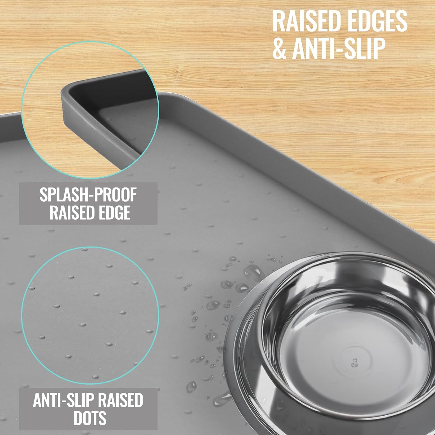 - 100% Waterproof & Keep Biwk in Place: Our silicone pet food mats waterproof with edges, waterproof dog mat for food and water and dog water matt for sloppy drinkers do a great job catching the water and food your puppy drops on the floor. The dot pattern on the surface and nonslip backing of the dog waterproof mat for dog water bowl and anti slip mat for under dog bowls keep your pet's bowl in place, making your pet enjoy his meal more intently and happily