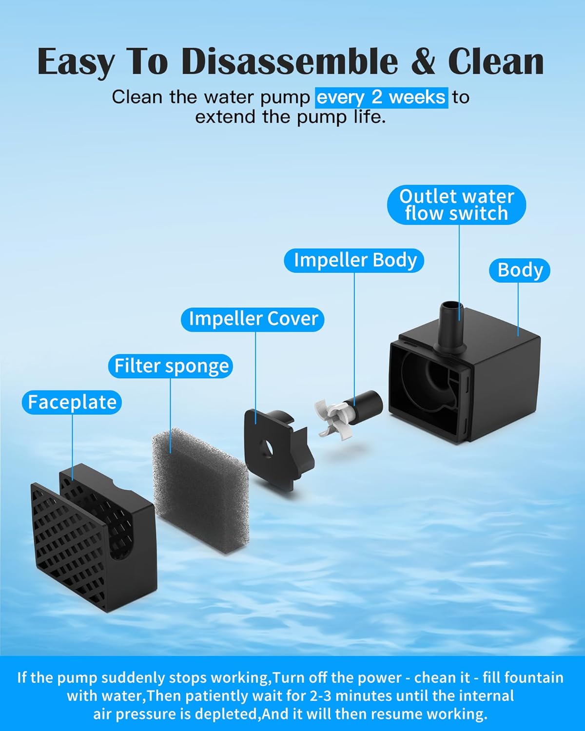- Easy to Clean & Maintain – Includes a 6.6 ft (2 m) power cord for easy placement. The pet water bowl dispenser pump can be disassembled without tools for quick cleaning. Built-in filter sponge traps pet hair and debris to keep water clean.