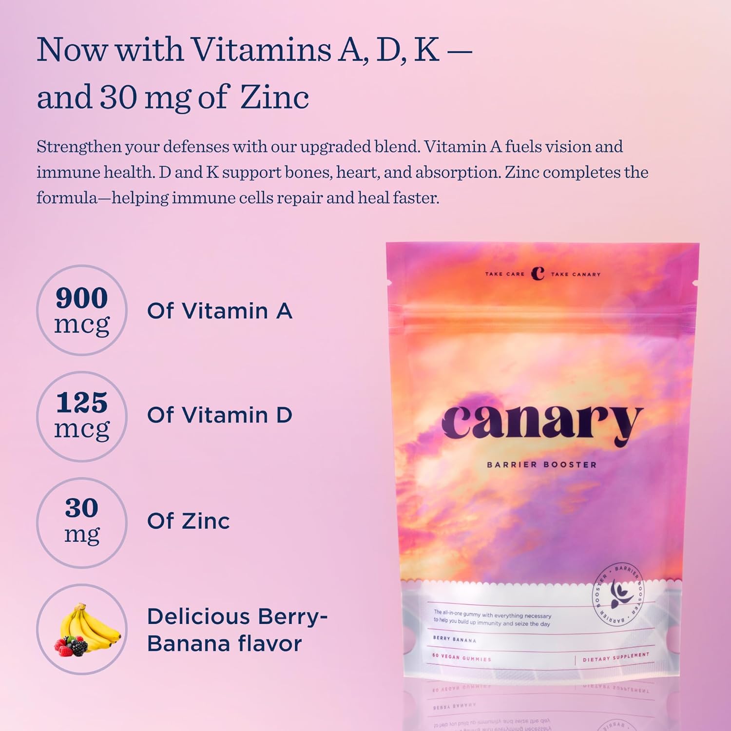 Canary Barrier Booster Vitamin A, D, & K and ZINC Immune Support Gummy - Great for Immune Support, Bone Strength, & Cardiovascular Health - Vegan Berry Banana Flavor, 60 Gummies