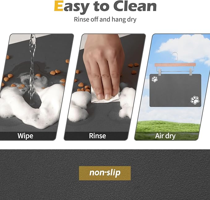 - 【Easy to Clean 】Unlike traditional silicone dog food mats, this easy to care dog mat for food and water does not stain pet hair or dust, nor does it accumulate difficult to clean scale.Simply wipe or rinse to keep it clean. surface will quickly air dry, keeping the dog bowl mat in a new state forever