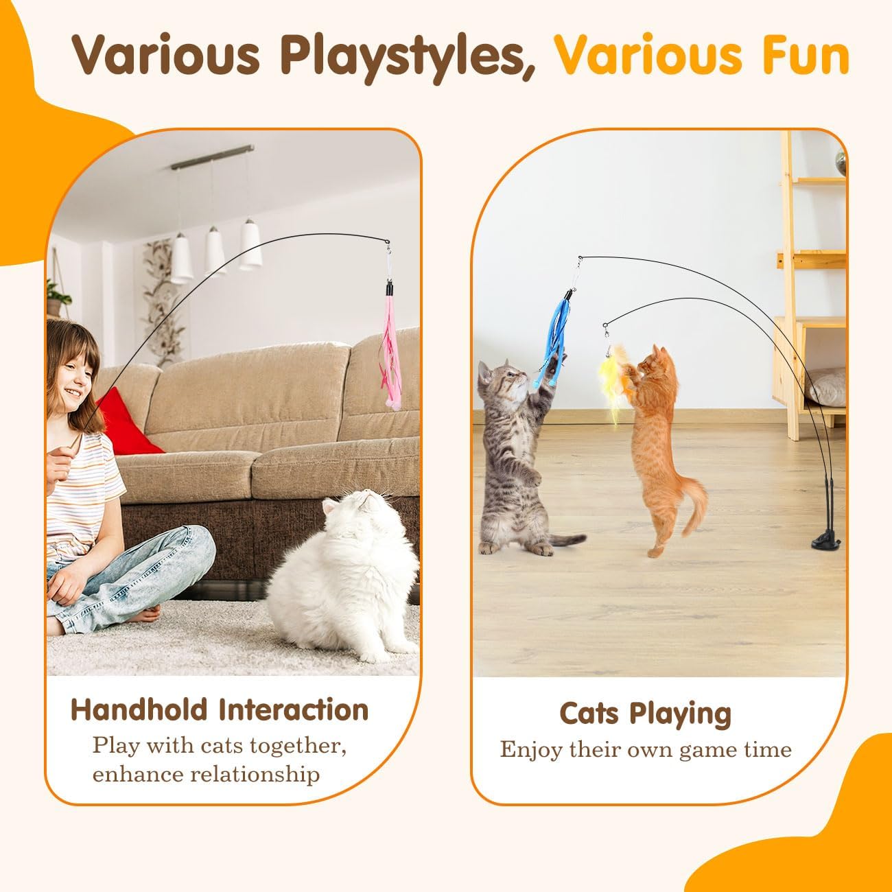 - 【Interesting Cat Teaser Toys】 37in springy steel wire cat teaser with far interactive distance, you can hold it to interact with the cute kitten, let it keep jumping and pouncing. Or insert the teaser into the suction cup slot, when you are busy or resting, cats can also play on their own to relieve loneliness and anxiety.