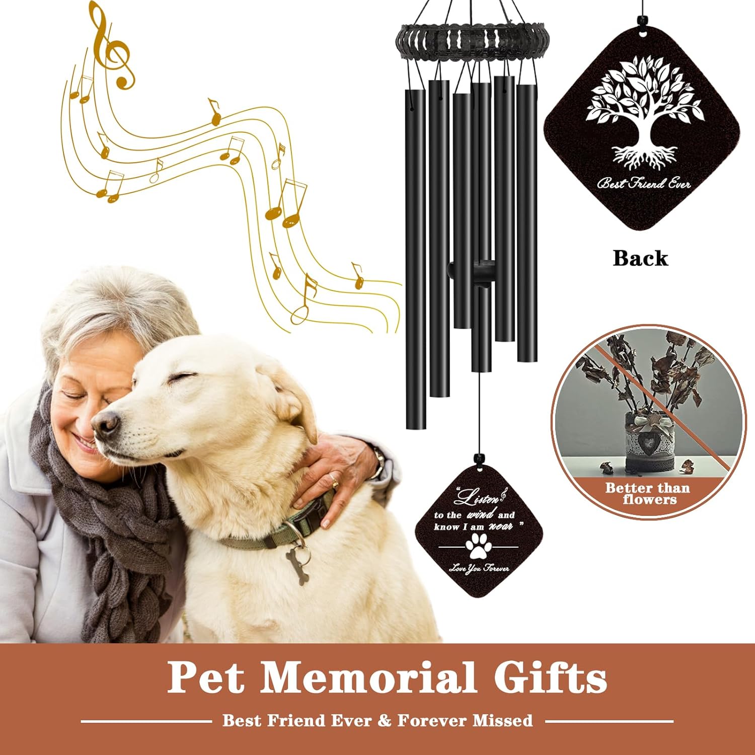 - Pet Memorial Gifts: Losing a beloved pet must be extremely painful, but our pet memorial wind chimes can bring comfort and healing to pet owners. The pet paw and text engraved on the pendant are as worthy of a deep memory as the beautiful imprints pets bring to their owners. "Listen to the wind and know I am near" is the best commemorative phrase for cherished pets.