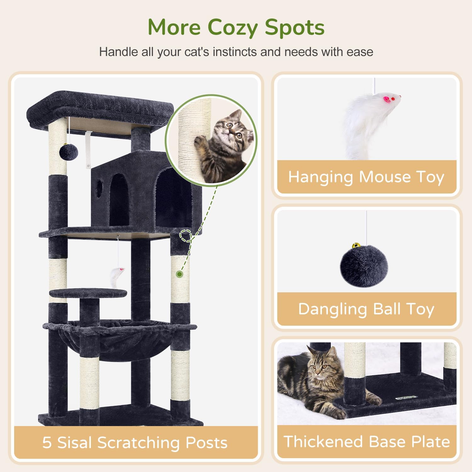 - Cat Scratching Posts and Toys: The cat scratching tree is equipped with 5 natural sisal rope cat scratching post, dangling plush balls and interactive mouse toys to satisfy your cat's scratching instinct and hunting desire. It not only relieves stress and protects your furniture, but also provides ample entertainment and exercise opportunities