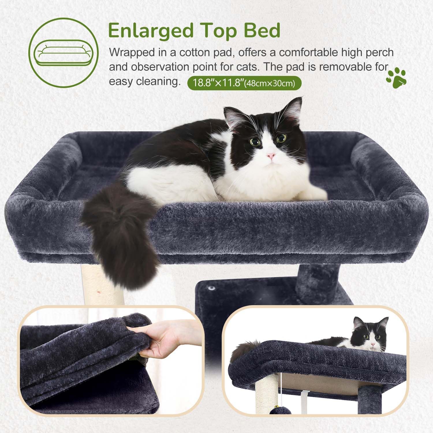 - Top Padded Platform Bed: The top perch bed (18.8" x 11.8") is soft and comfortable to sit on, and the height is moderate, which is very suitable for cats to watch, and it is also convenient for owners to interact with cats. The top cover of the bed can be removed for easy cleaning, ensuring that your cat always has a clean and comfortable resting environment