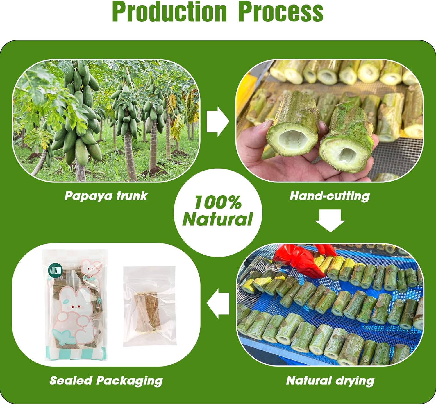 - 【100% organic papaya wood】Rabbit chew toys for bunnies are made from fresh papaya trunks that exude the fragrance of plum aroma. They are made of natural materials and are purely handmade without any additives. It is produced through manual cutting, natural drying, and sealed packaging to give your pet a healthy and safe enjoyment! Sealed packaging ensures long-term storage without deterioration.