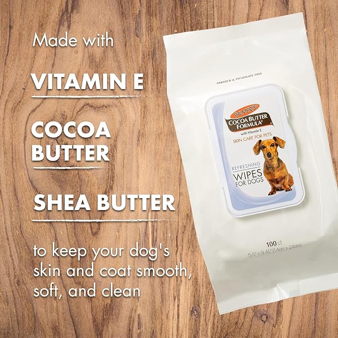 - MADE WITH COCOA BUTTER AND VITAMIN E – These dog wipes for dogs from Palmers are made with cocoa butter and vitamin E to keep your dog's skin and coat smooth, soft, and clean
